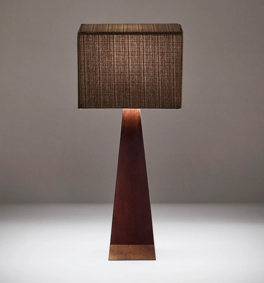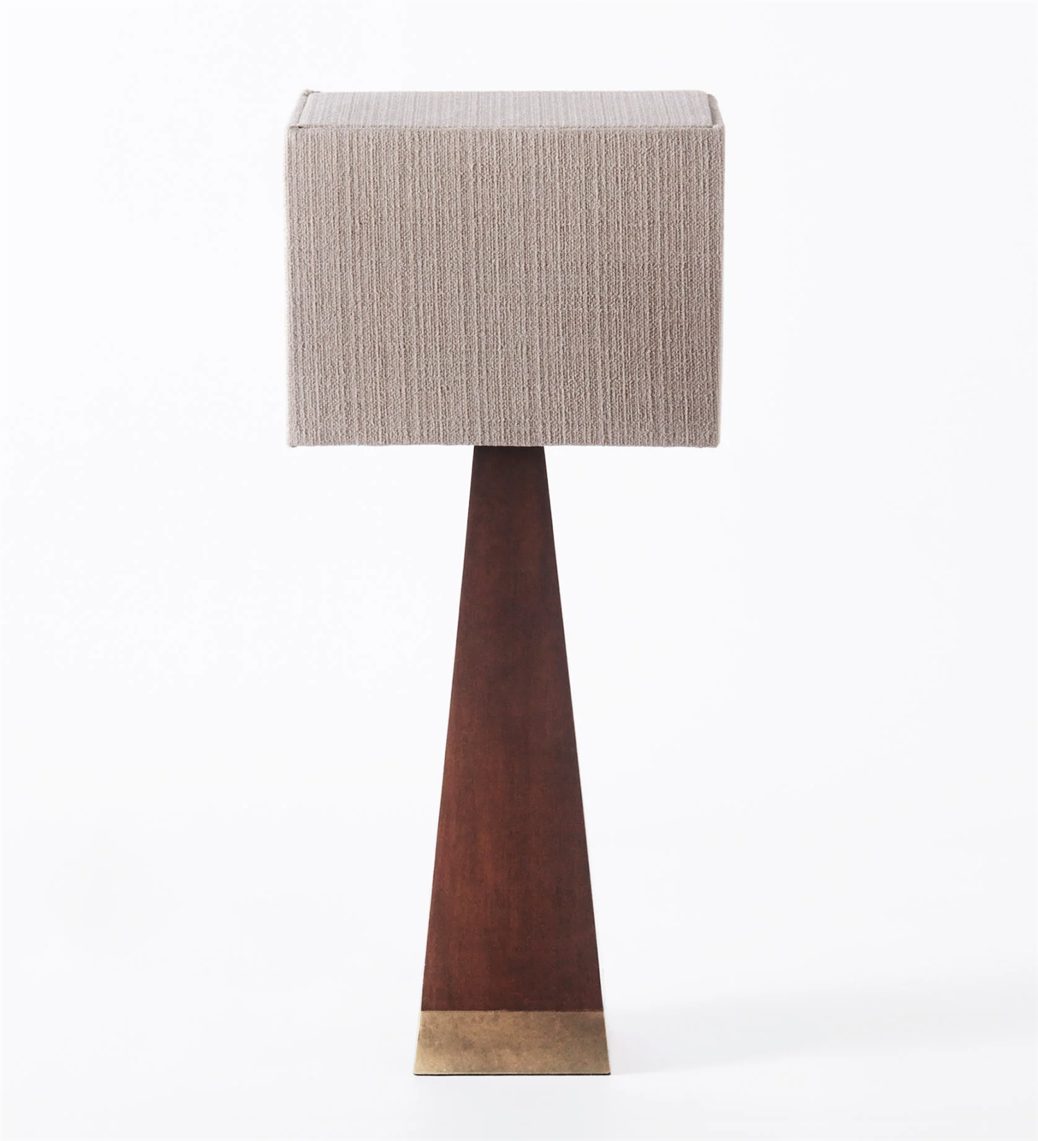 Pyramid Table Lamp är en bordslampa tillverkad i odlad mahogny med mässingsdetaljer i botten. Basen av mässing har patinerats för en vintagelook. En kubisk skärm av textil sprider ett mjukt ljus runt omgivningen. Pyramid Bordslampa kan placeras i sovrummet på nattduksbordet, eller i vardagsrummet bredvid en soffa eller fåtölj. Utöver denna bordslampa innehåller Pyramid-serien även en golvlampa och ljushållare av marmor.