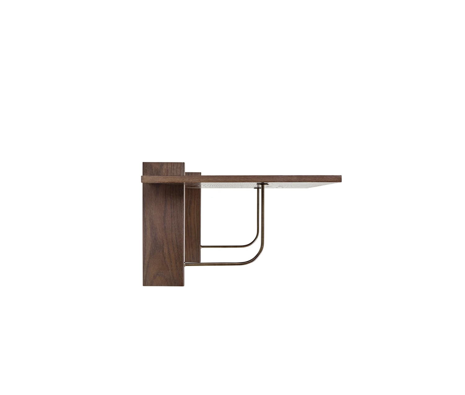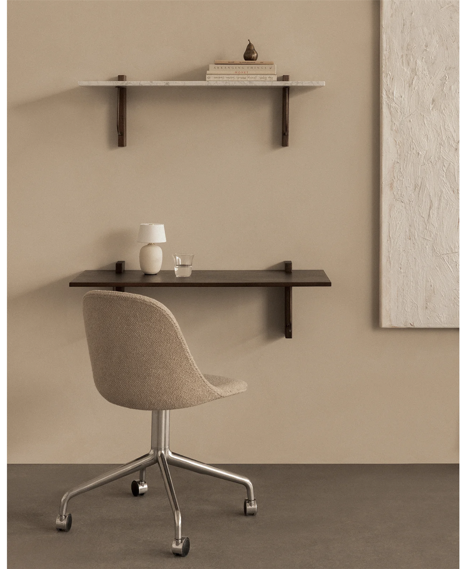 Designed to seamlessly transition into home settings, catering to remote work and the need for stylish yet functional home office furniture, the Corbel Wall Desk delivers a flexible, space-saving solution particularly beneficial for smaller spaces. The shelf takes its name and design cues from architectural weight-bearing brackets traditionally made from stone or wood. This inspiration infuses the design with a sense of structural elegance. Designed with a small distance to the wall for neat cord management, solid wood edges enhance the table top's durability, while the smooth linoleum desk surface contributes to a practical and professional workspace. The wall-mounted design can be paired with the series shelf to create a minimalist home office setup.