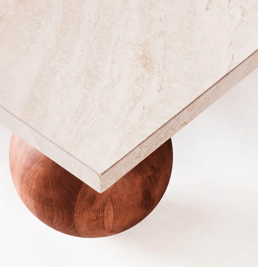 Sphere Square Sofa Table är ett modernt soffbord med en design baserad på två geometriska figurer, sfären och kuben. Den massiva bordsskivan är gjord av en marmor som kallas travertin, som är en sten med ljus, vit ton där varje skiffer är unik. Detta förstärker bordets karaktär och gör varje bord unikt. Bordsskivan kontrasteras av de sfärformade fötterna i massiv bok. Fötterna har färgats och oljats för att få en mörk ton. Utöver Sphere Square Sofa Table finns även ett liknande bord, men med en rund bordsskiva.