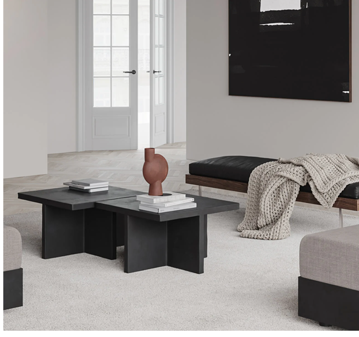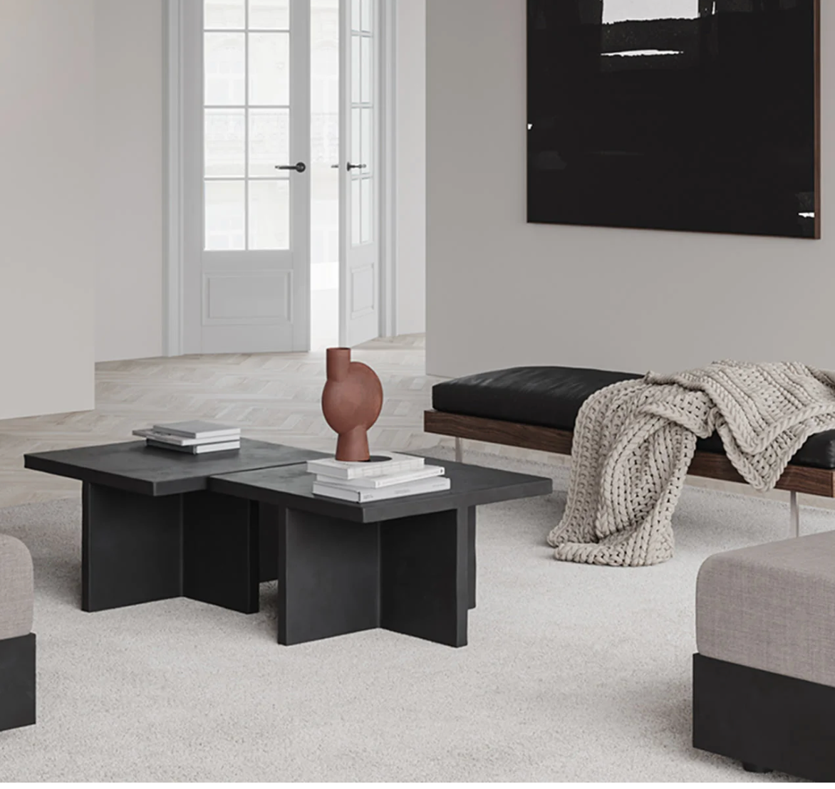 Inspired by the Brutalist architecture movement of the mid-20th century, the Brutus collection comprises a dining chair, a lounge chair, a stool and a coffee table cast in lightweight fiber concrete creating a unique surface texture increasing mobility. Each piece is hand painted to create a textured, unique surface. Emphasizing the fine balance between sharp architectural lines and a somewhat softer curve in the back and armrest, the Brutus collection is sculptural statement pieces with a compelling seating comfort.