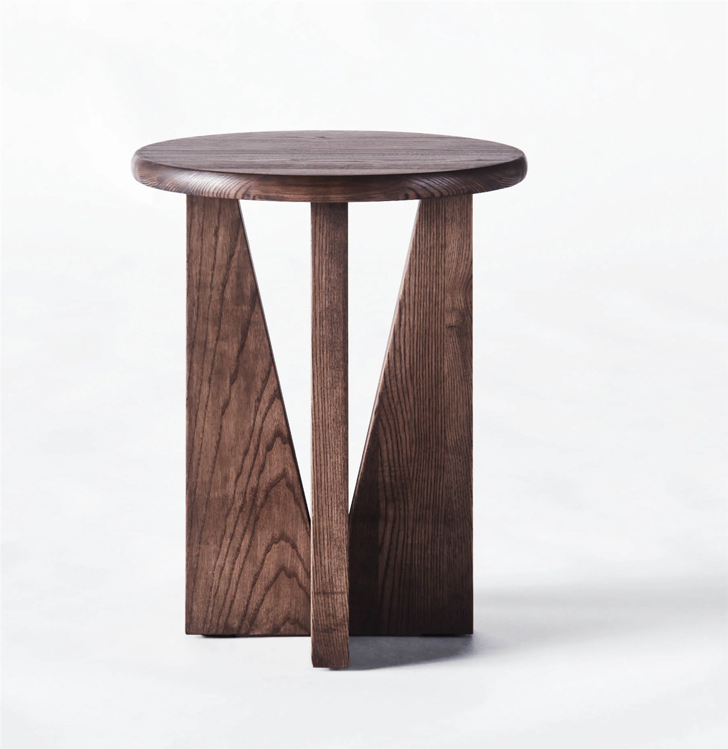V Side Table är ett bord av massiv ask. Den runda bordsskivan vilar på en bas som består av triangulära ben som tillsammans skapar en V-form. Bordet är handgjort av duktiga snickare med lång erfarenhet. Materialet har färgats och vaxat för att få rätt intryck och ger en känsla av vintagemöbler.