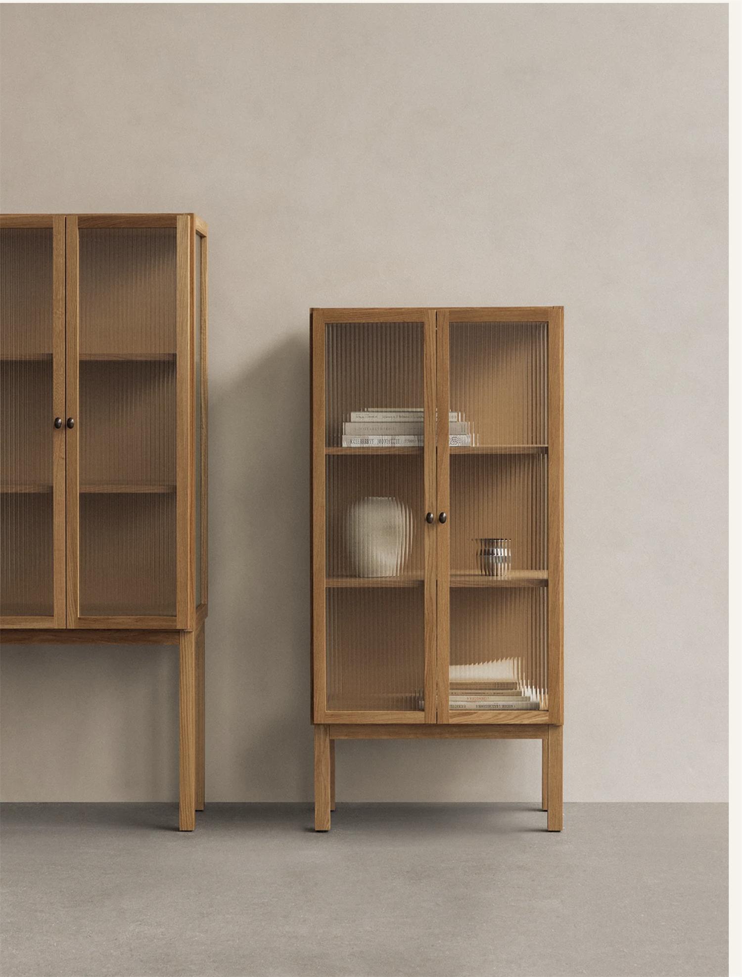 A beautiful and modern rendition of a timeless furniture piece, the Curiosity Cabinet is carefully crafted in solid oak using traditional joinery techniques. Designed to store objects almost out of sight thanks to its elegant reeded glass doors that gently blur the contents within, it opens to reveal two height adjustable oak veneer shelves for ample room to store your objects. Brass hinges and handles complete the design. Available in low and high versions.