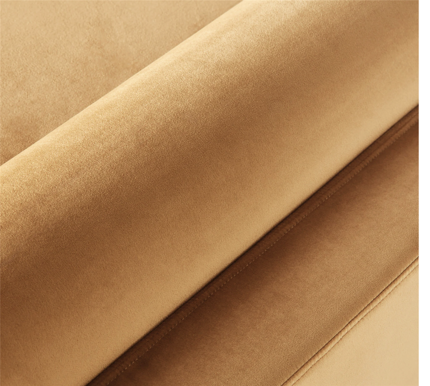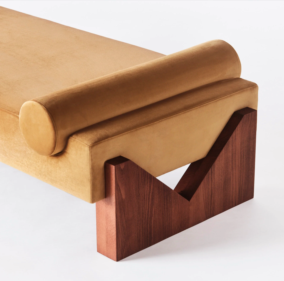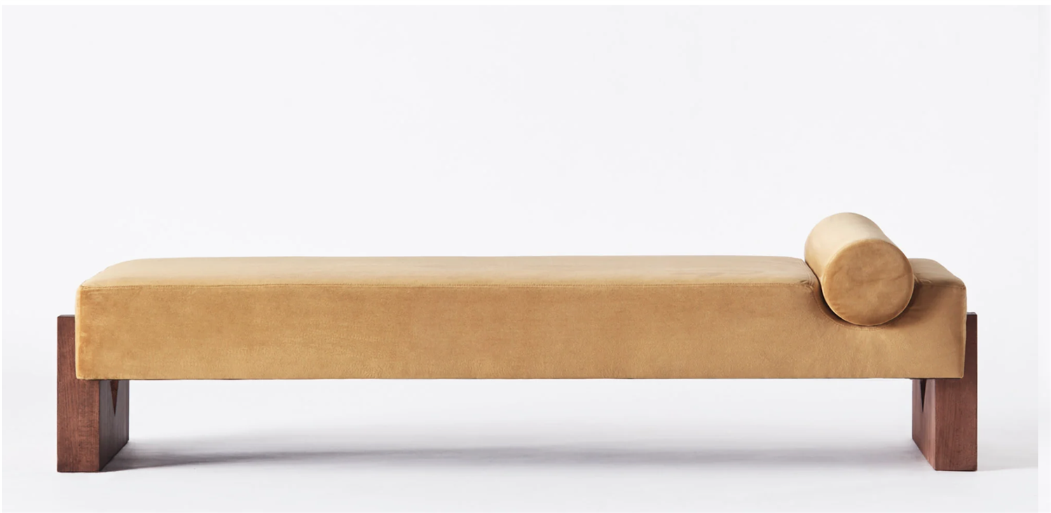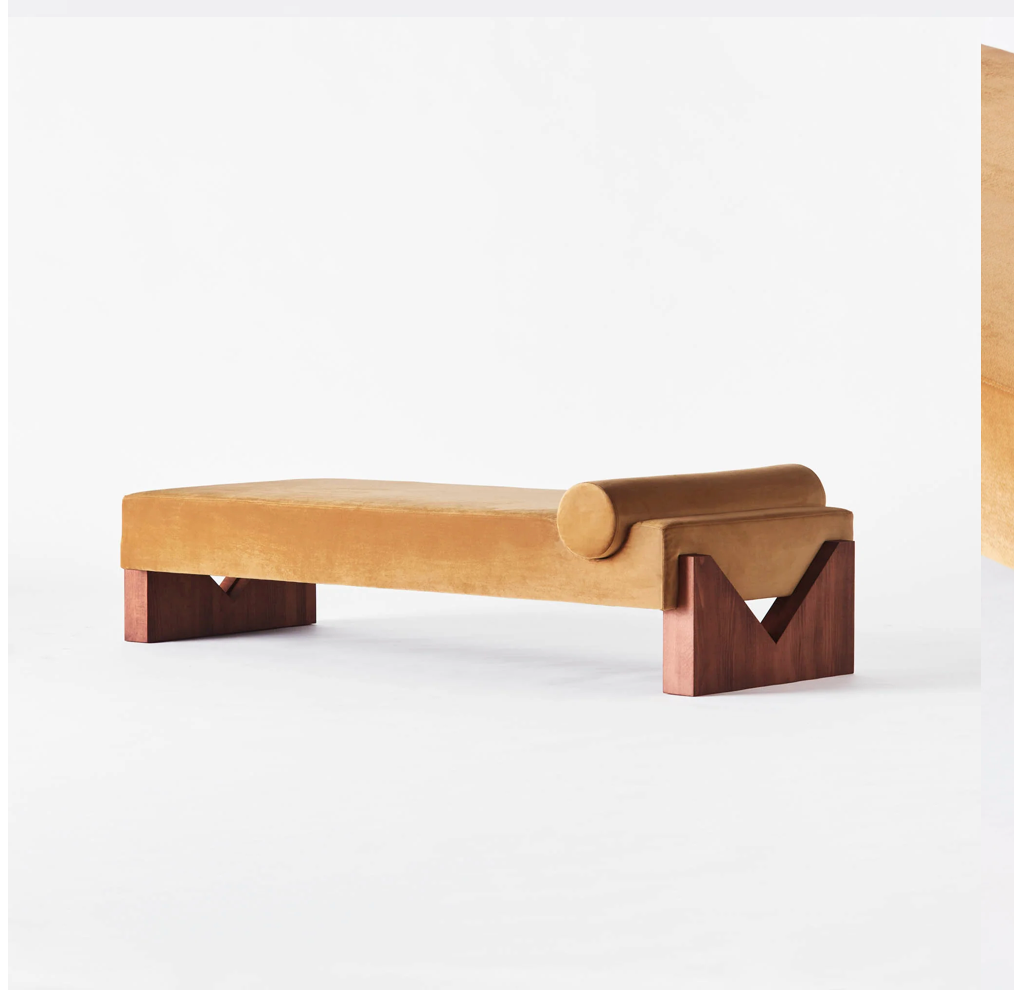 V Day Bed Velvet är en handgjord dagbädd gjord av hantverkare med lång erfarenhet av trä och klädsel, denna dagbädd har en ram och ben som gjorts av massiv bok. Benen kännetecknas av sin V-form, en estetisk signatur för flera av Dusty Decos möbler. Träet har betsats och vaxats för att få rätt färg och känsla, något som för tankarna till äldre vintagemöbler. I denna version är V Day Bed Velvet täckt av en senapsgul textil som ger den ett mysigt och varmt uttryck.