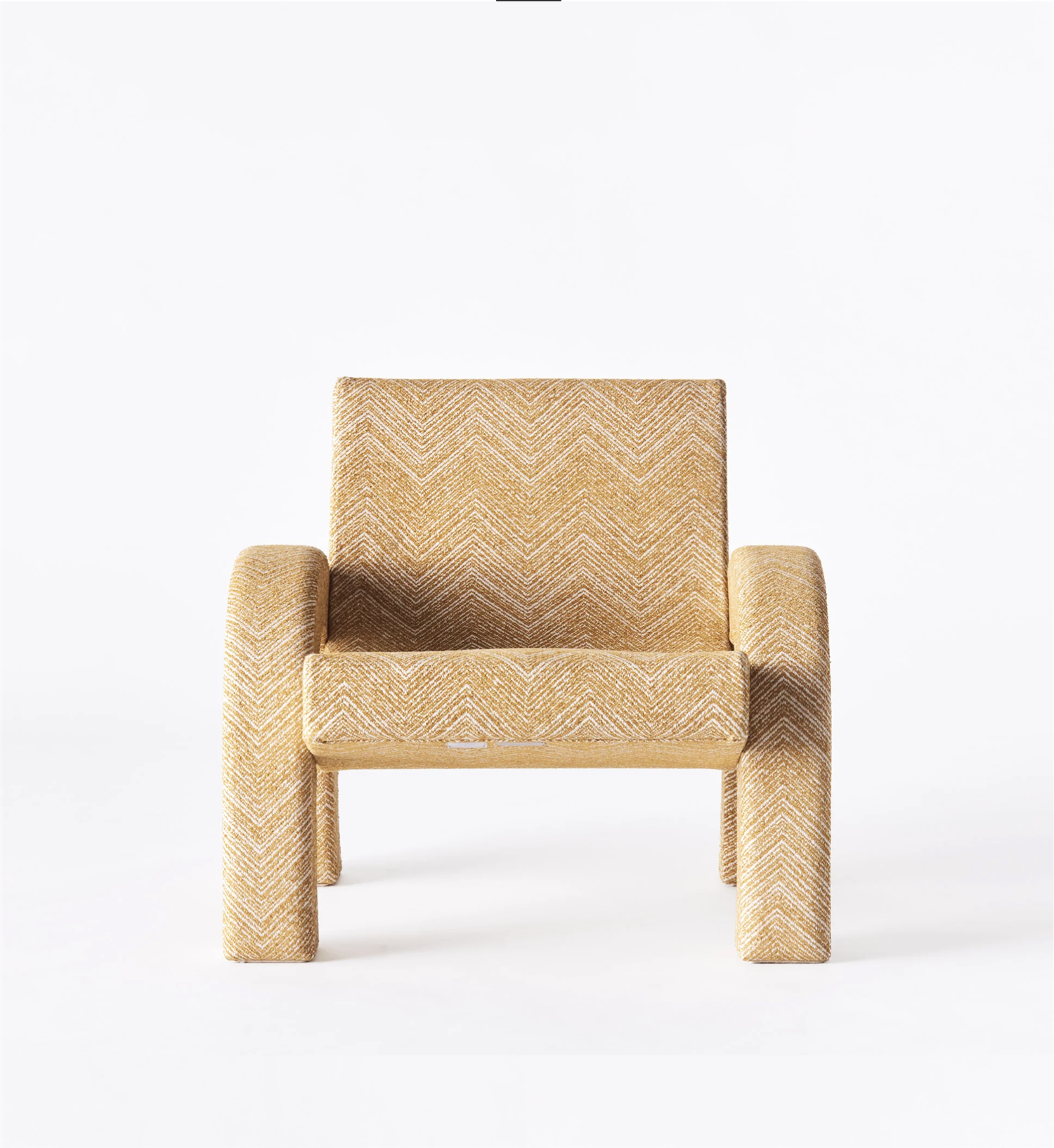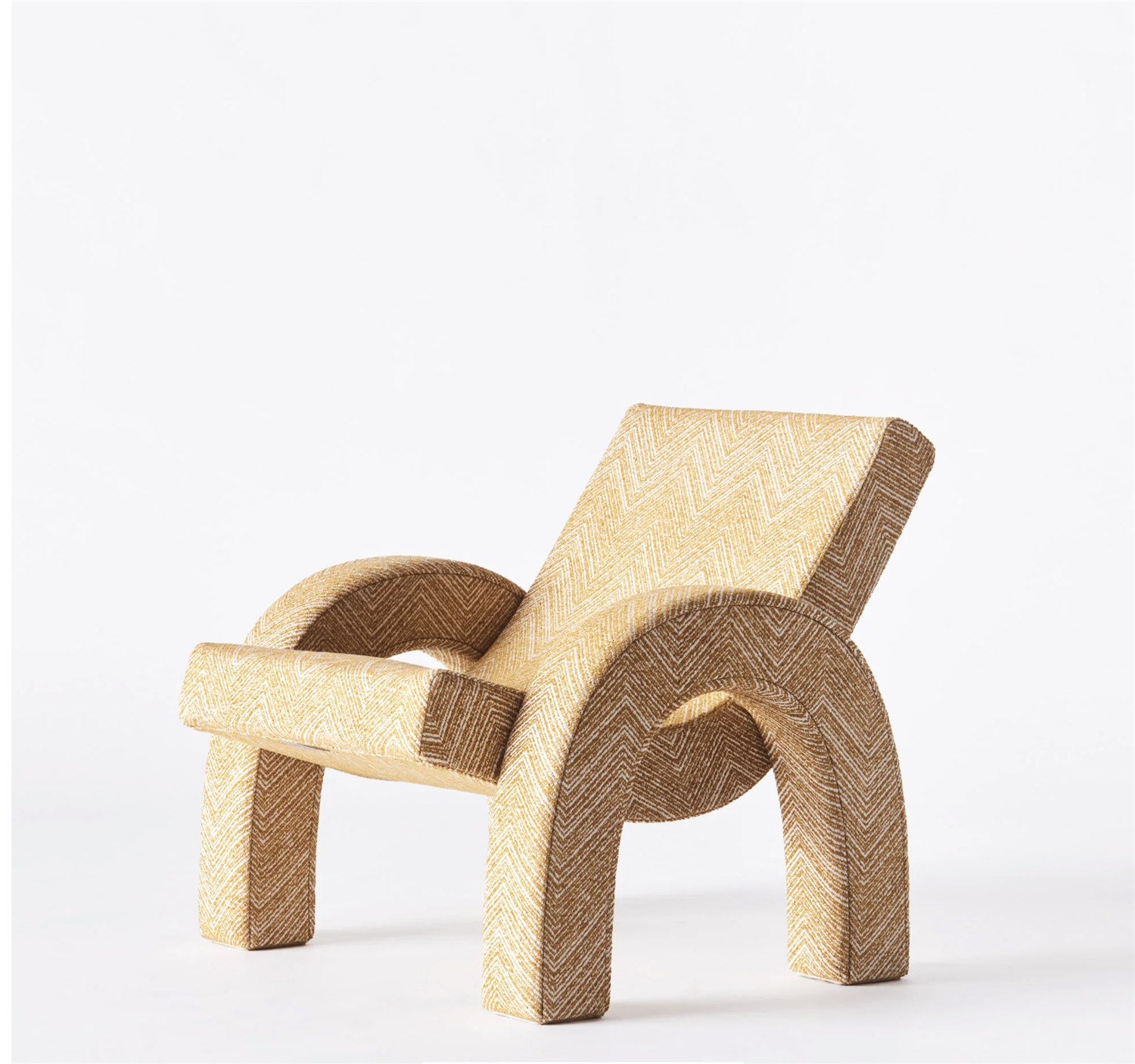 Med inspiration från känd arkitektur som Triumfbågen i Paris och Triumfbågen i Barcelona föddes Arco Lounge Chair. Denna version har klätts i ett Teide Ochre-tyg med ett sicksackmönster. Stommen är gjord av bok och plywood, medan sitsen är gjord av nozagfjädrar.
