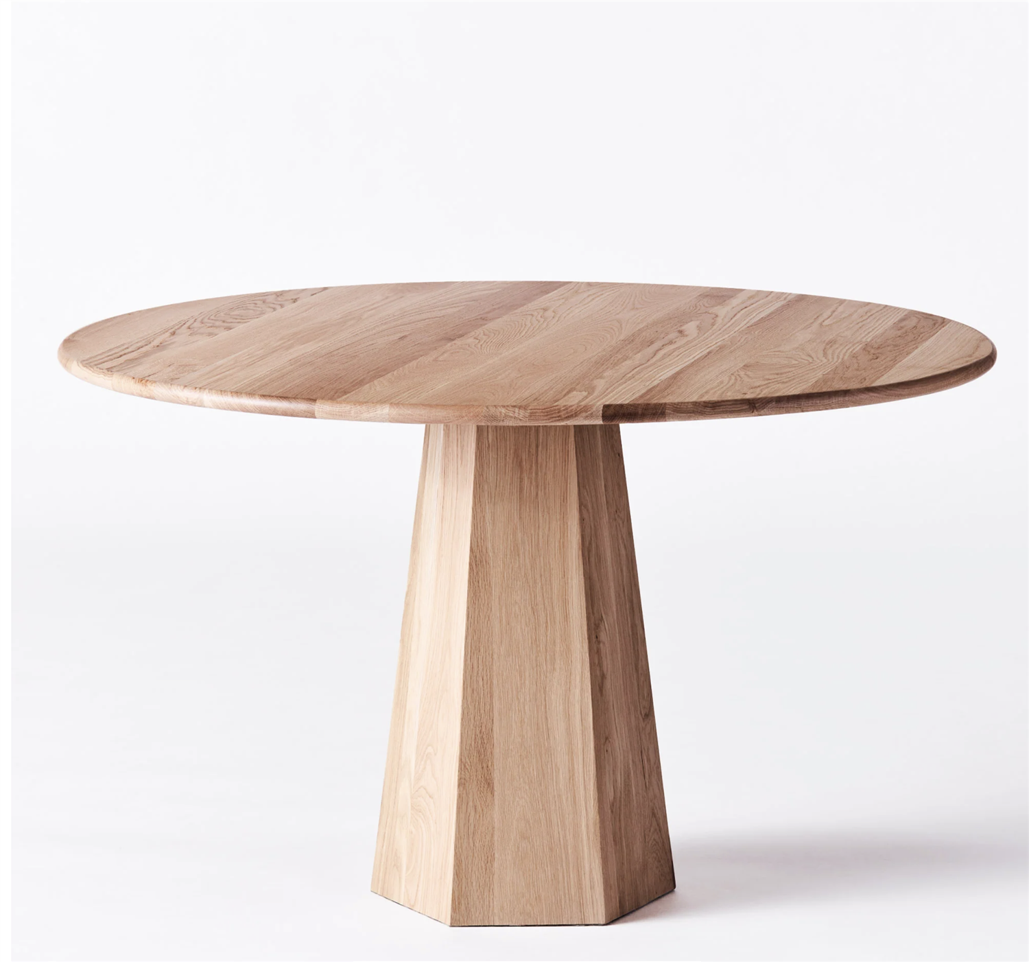 Hexagon Dining Table Oak is a modernist dining table with a hexagonal shaped base and a round table top. The table is made of solid oak and is available in two sizes, 90and 120 cm in diameter. Thanks to its unique hexagonal base, the Hexagon dining table enhances the aesthetics of your dining space, offering a contemporary twist that combines form with function in a timeless design.