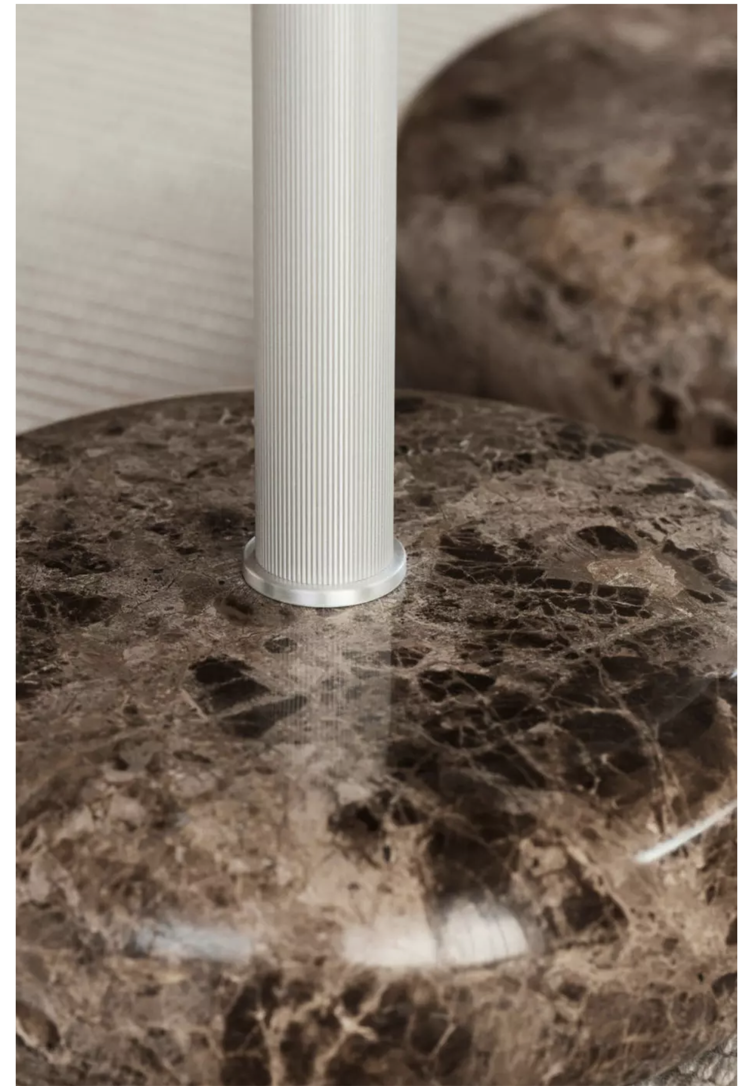This dark polished natural stone then provides excellent stability for the grooved supporting column, as well as the finely brushed aluminium tabletop that sits on top.