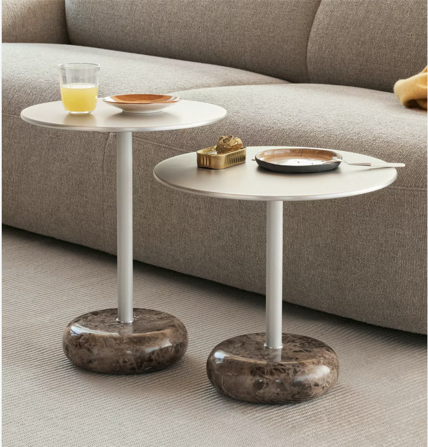 Taking aesthetic references from the smoothed stones found washed up on the shore and the horizon line that float above it, the Ton Side Table’s base is made from a heavy Emperador marble, hence the name.