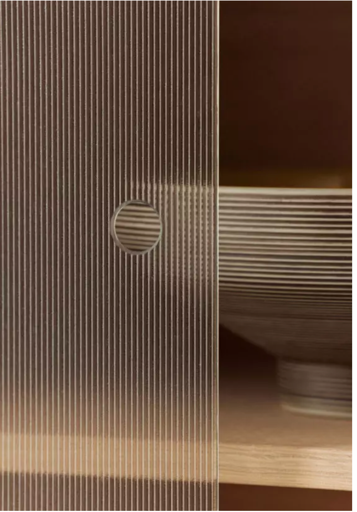 Finely fluted and tempered, with a tint of bronze, the intriguing matt and semi-transparent front hints at what’s inside without giving away too much. Meanwhile the perfectly proportioned oak frame and sleek metal legs keep everyday items safely stored, while still allowing you to elegantly display your favourites on top.