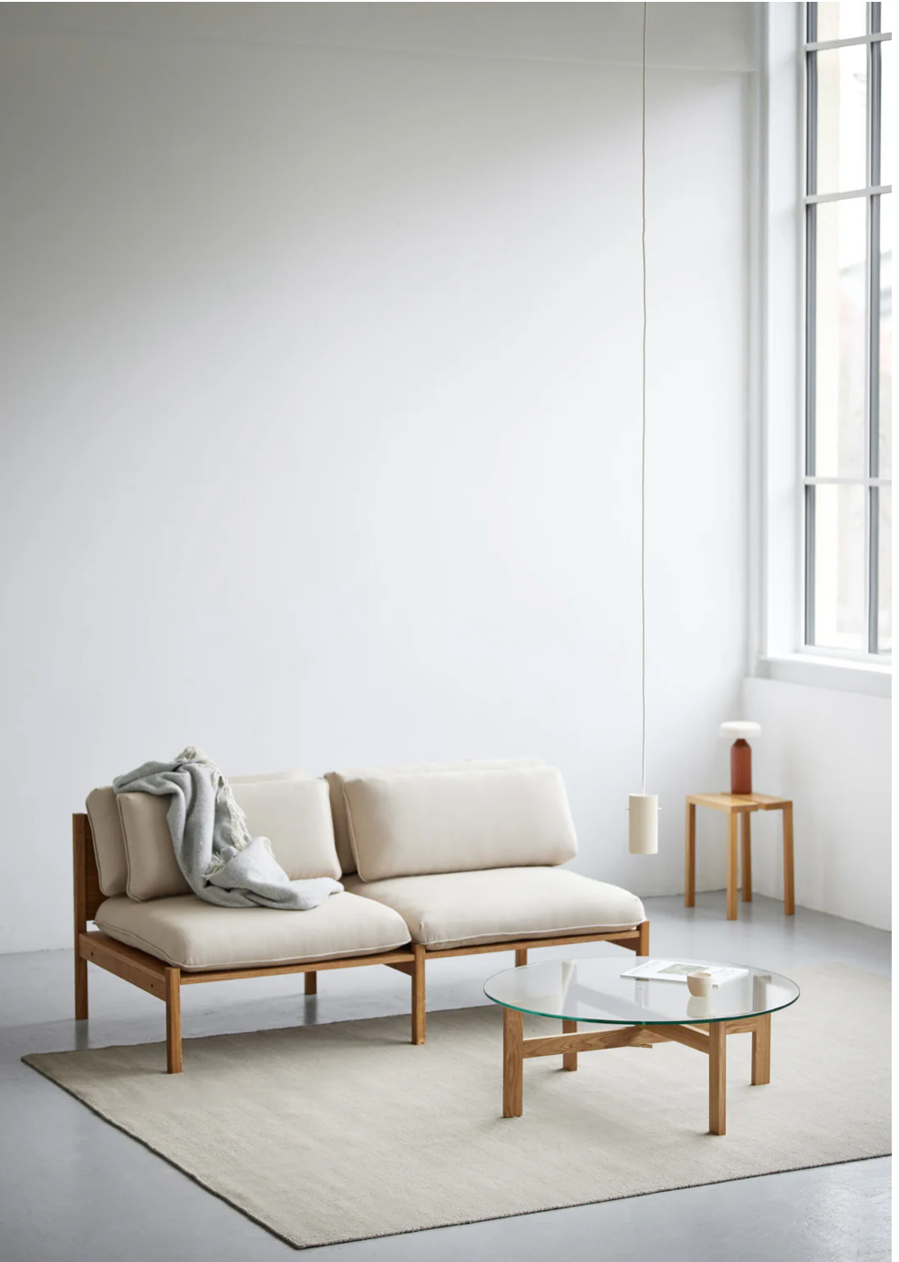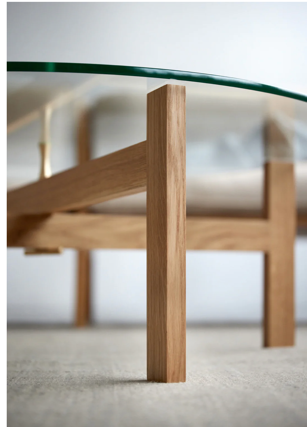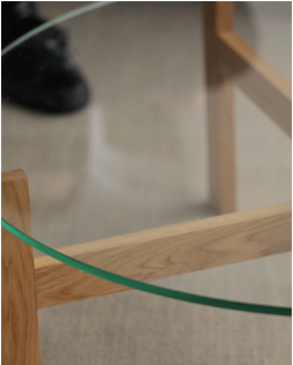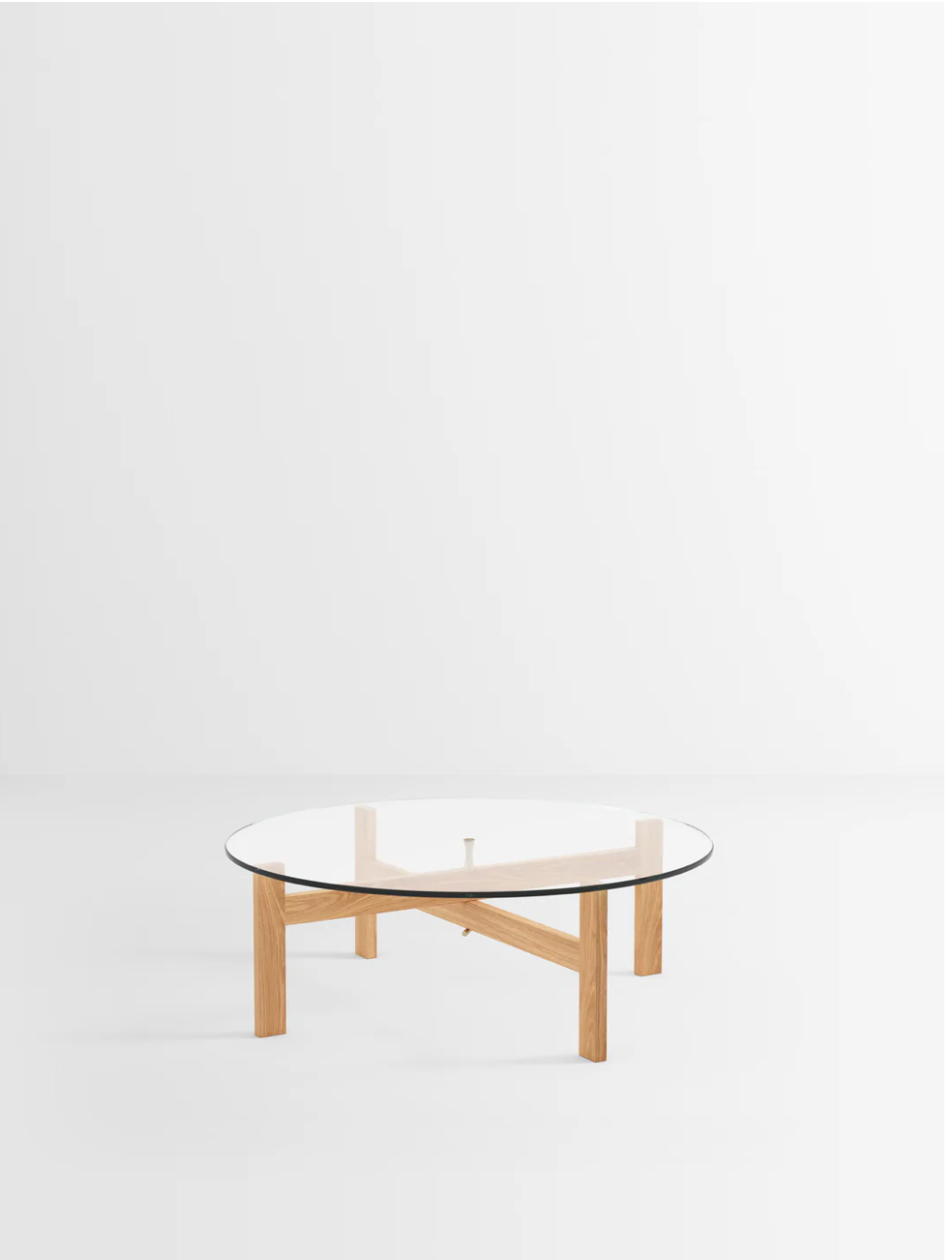 The MOEBE Round Coffee Table is low in profile, standing just 30cm from the floor. The cross-shaped leg frame is threaded together piece by piece with a brass screwing mechanism at it's centre, proudly displaying the construction for all to see. And what better way to finish it off than with a glass table top?