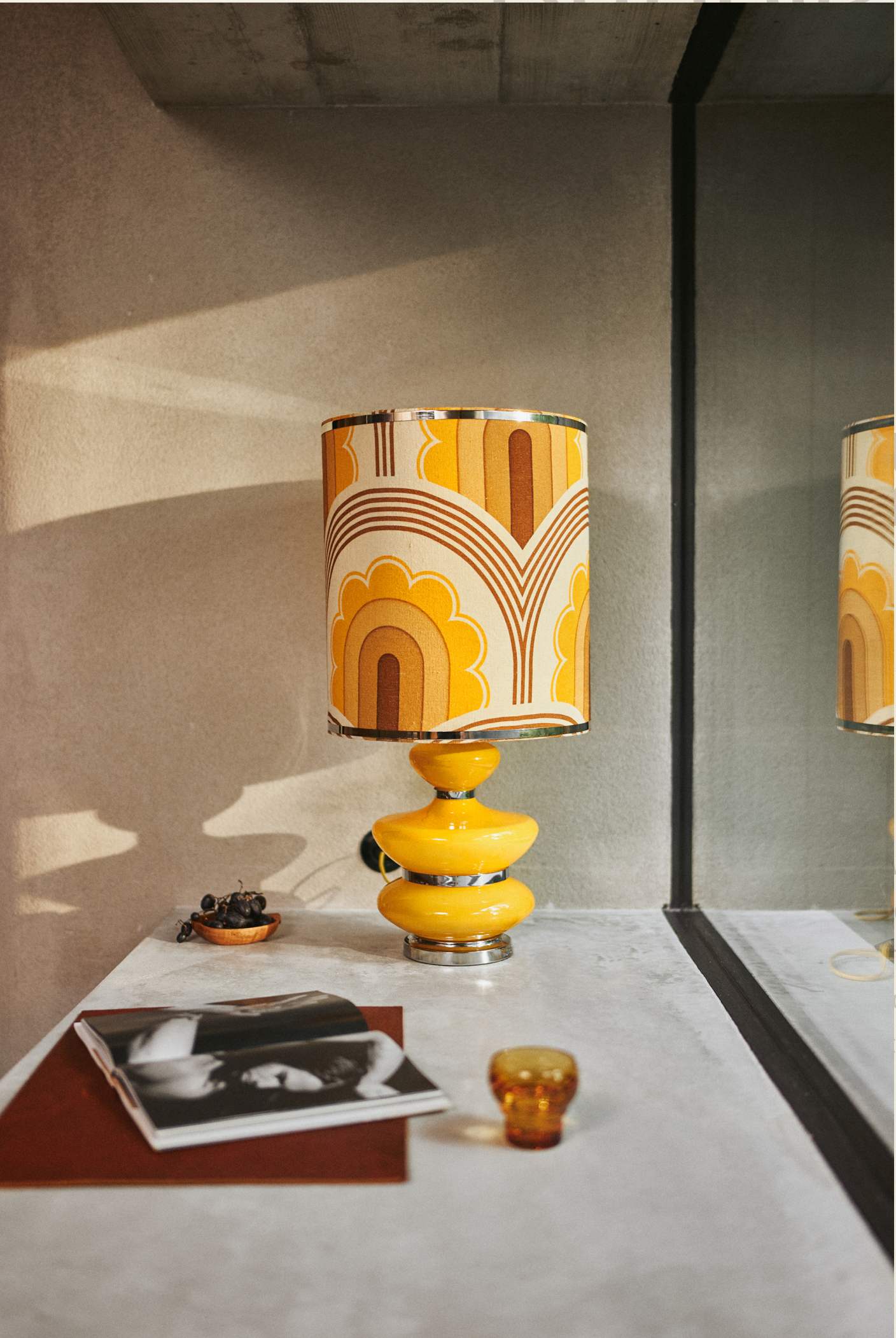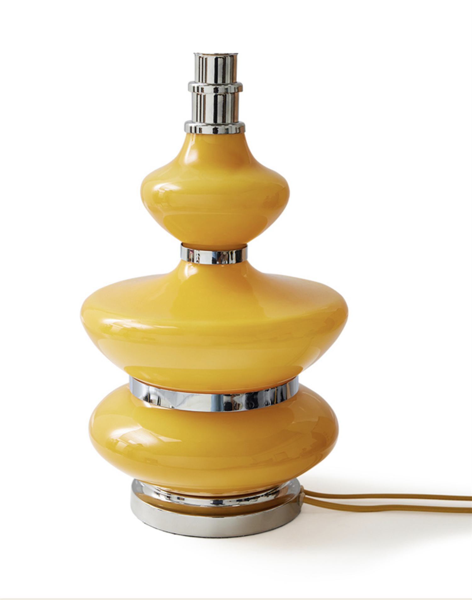 Elevate your lighting and let the charm and warmth of the space age be the centrepiece of your living room, study or bedroom. The Bubble lamp base is a celebration of the bold aesthetics of the 1960s and 70s, updated for the contemporary home. The polished chrome accents provide a striking contrast to the smooth coloured glass, creating a look that is both retro and modern. Versatile in design, this base can be easily combined with a variety of lampshades from our collection. Choose a plain, solid coloured shade for a subtle look or opt for a patterned design to make a vibrant style statement. The adaptable nature of this base allows you to change the shade to suit your mood or decor.