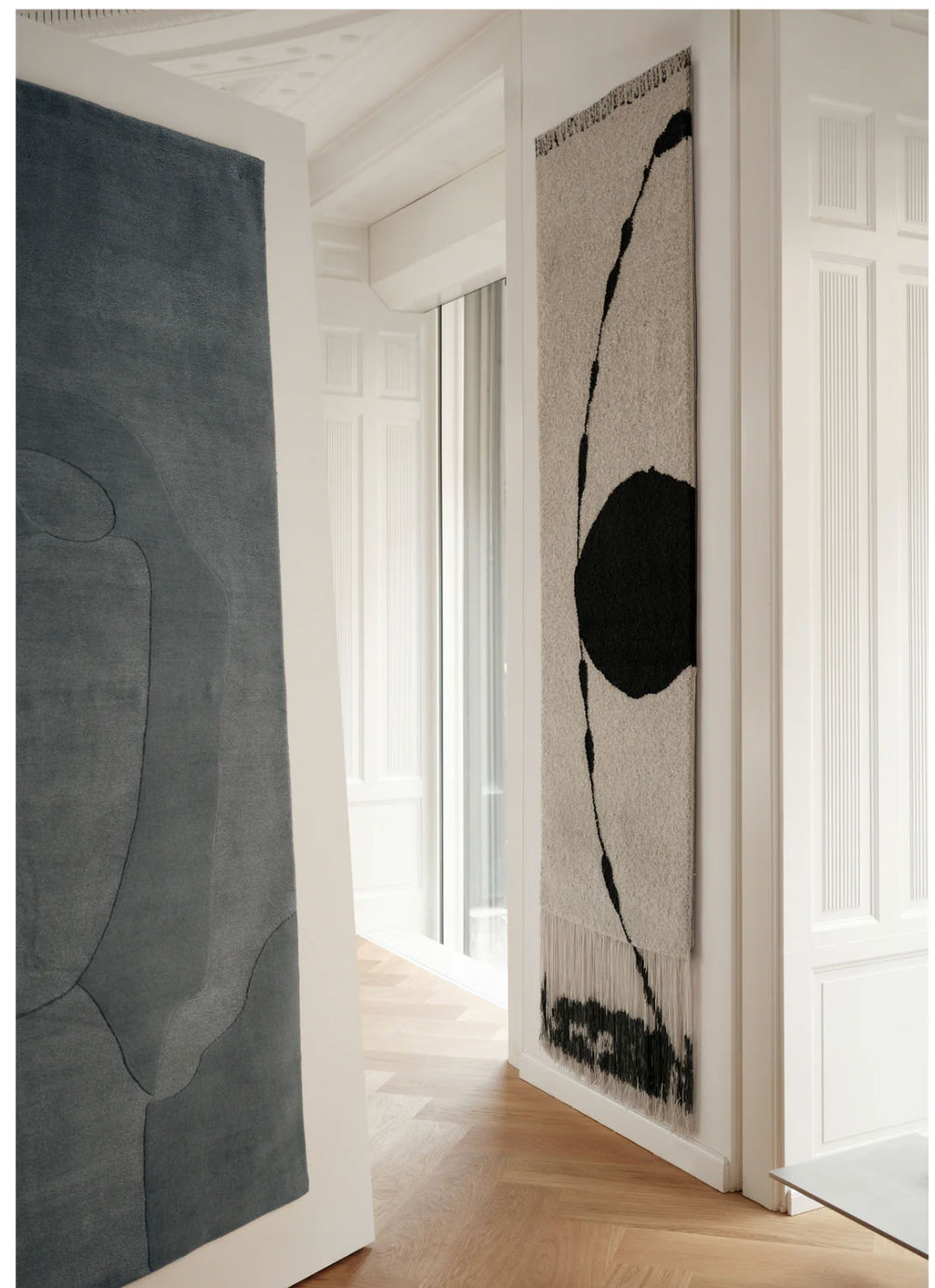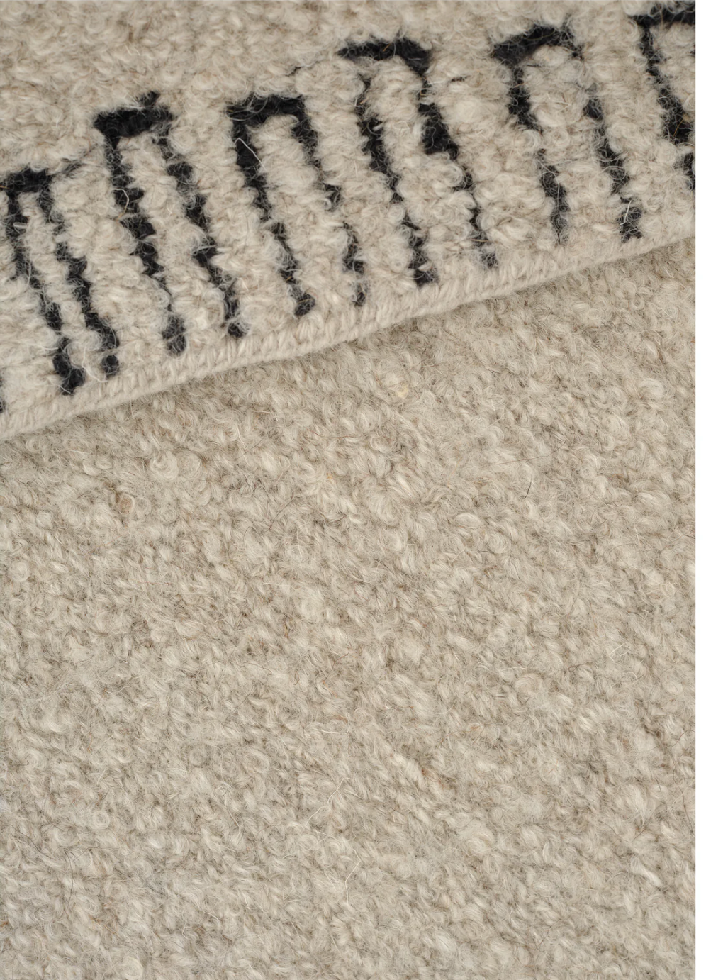 Featuring an abstract arched line with a bold circular form, Zenith Moon offers a bold expression that stands strong in its own presence. Knotted in a soft New Zealand wool boucle, the tactile quality of the surface interacts beautifully with the long, patterned fringes.
