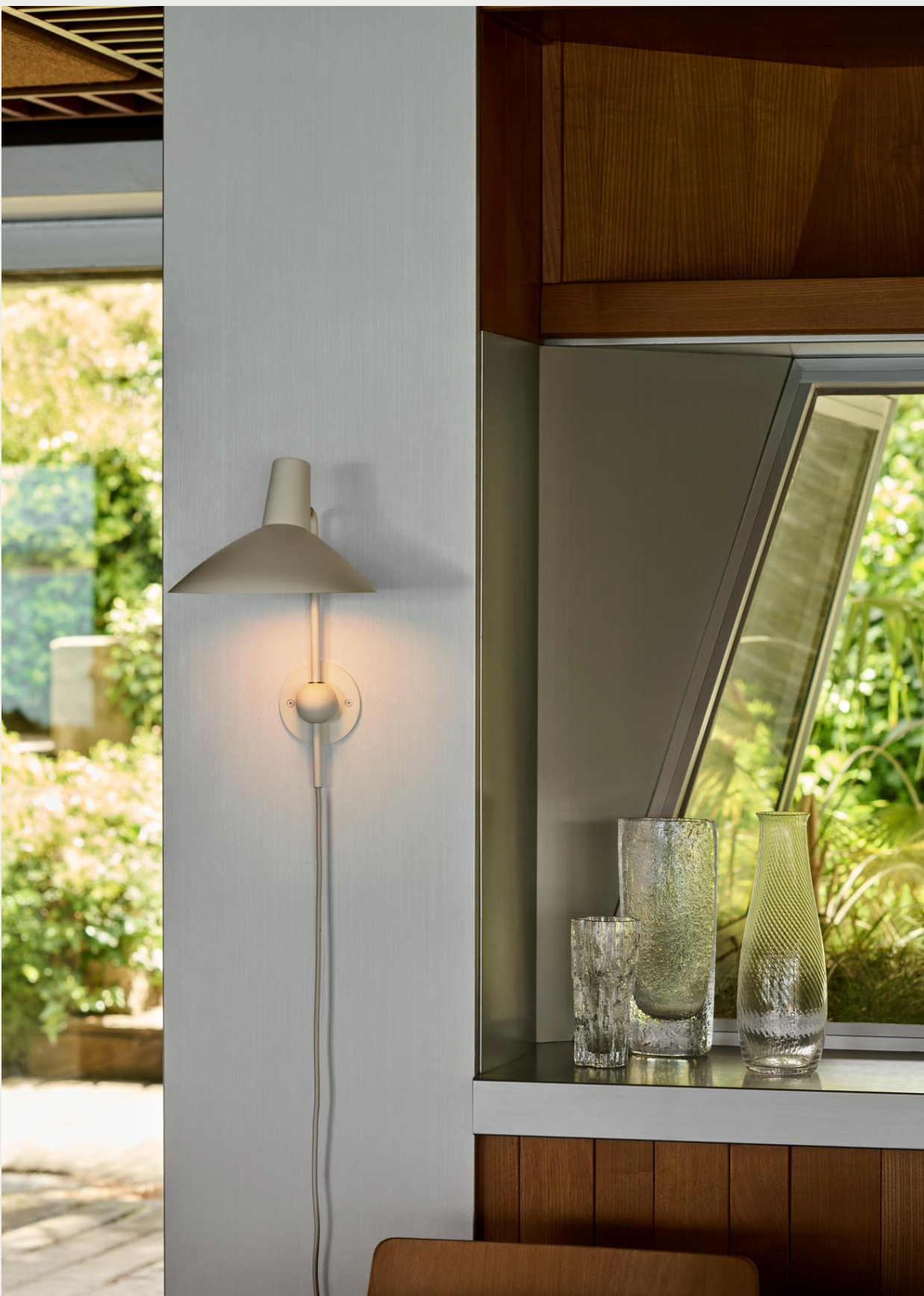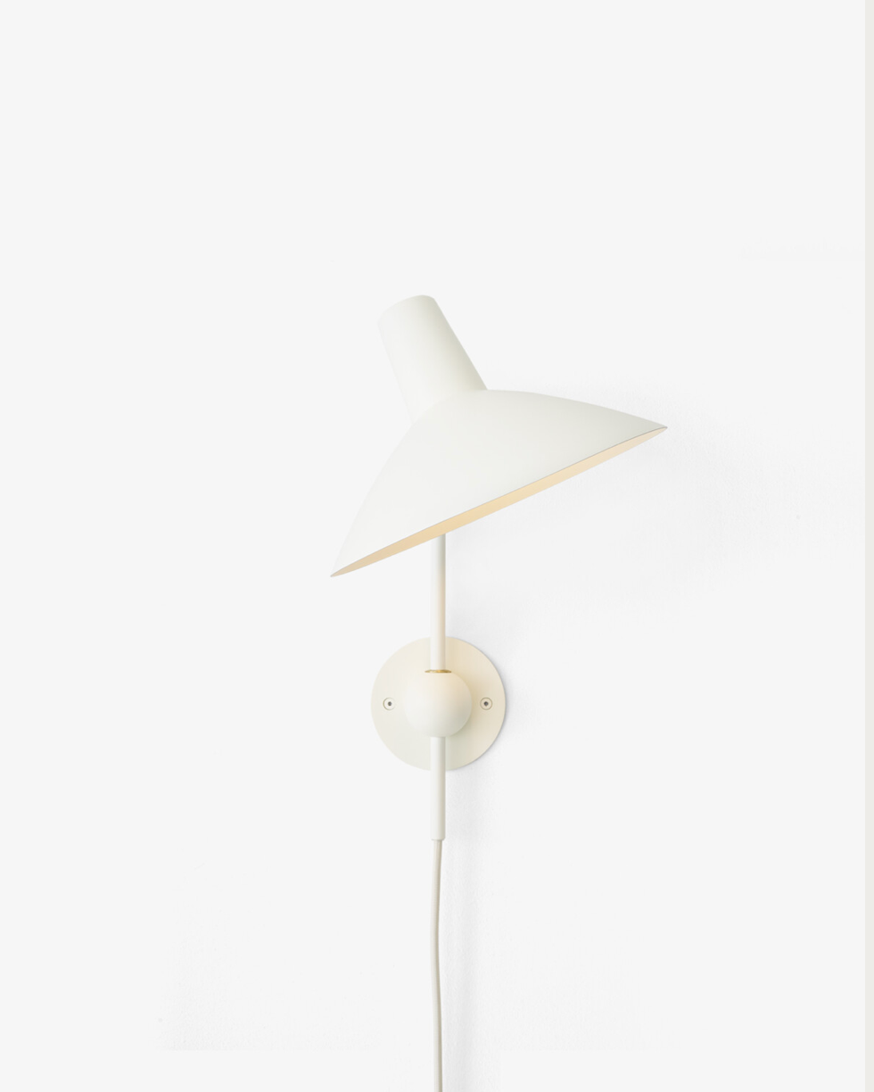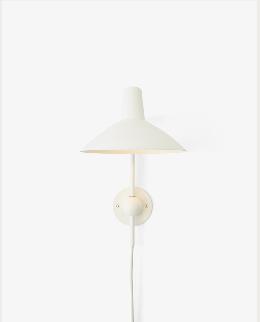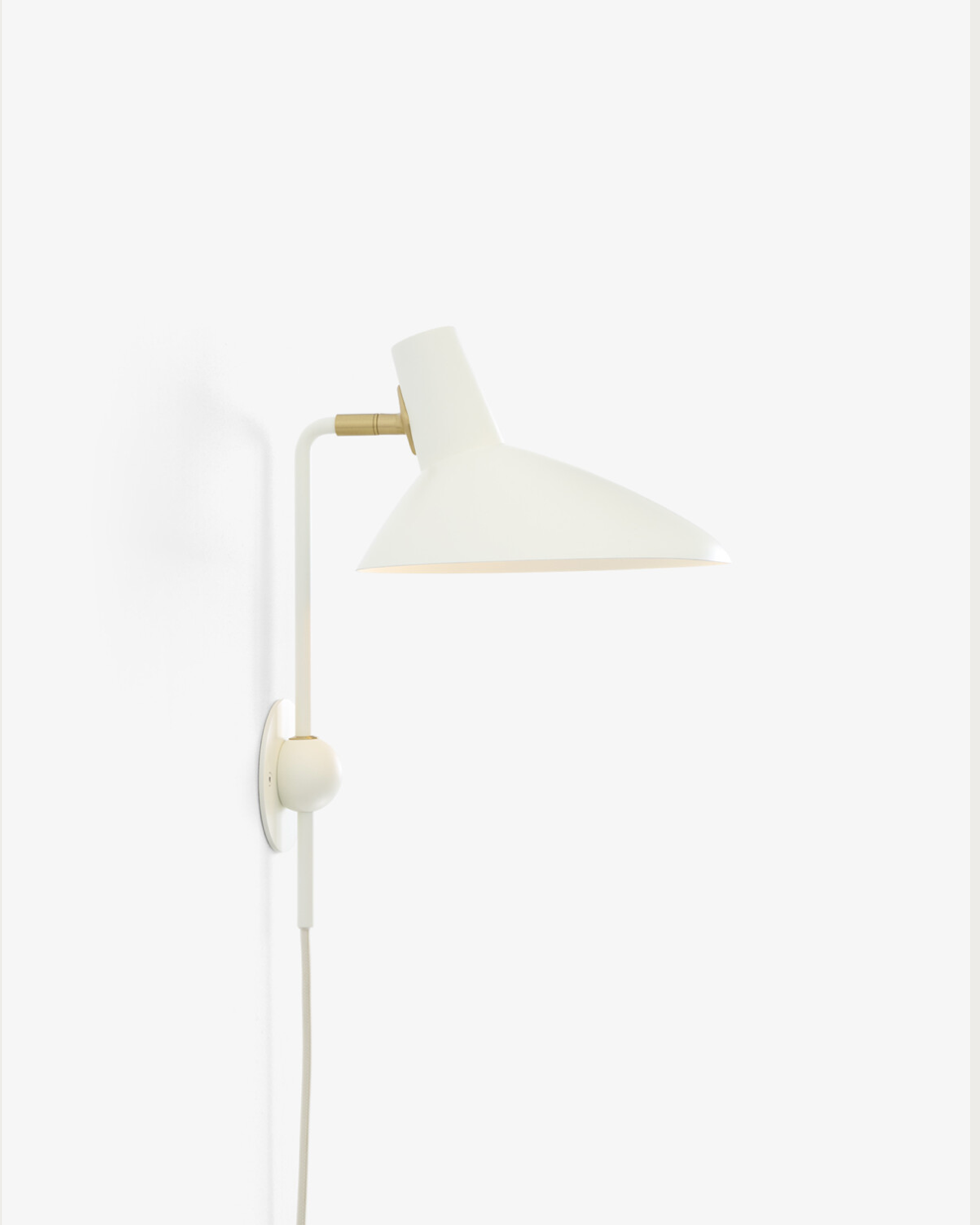 An adaptation inspired by sketches of the original lamp by Hvidt & Mølgaard, the new Tripod Wall Lamp remains true to the essence of the Tripod design. Crafted from lacquered aluminum, the wall lamp is anchored by a spherical base that establishes a visually solid foundation, while the shade’s swivel feature allows the lamp to distribute a generous diffusion of light. The addition of a new colourway, white with brass details, illustrates the timeless appeal of a classic design.