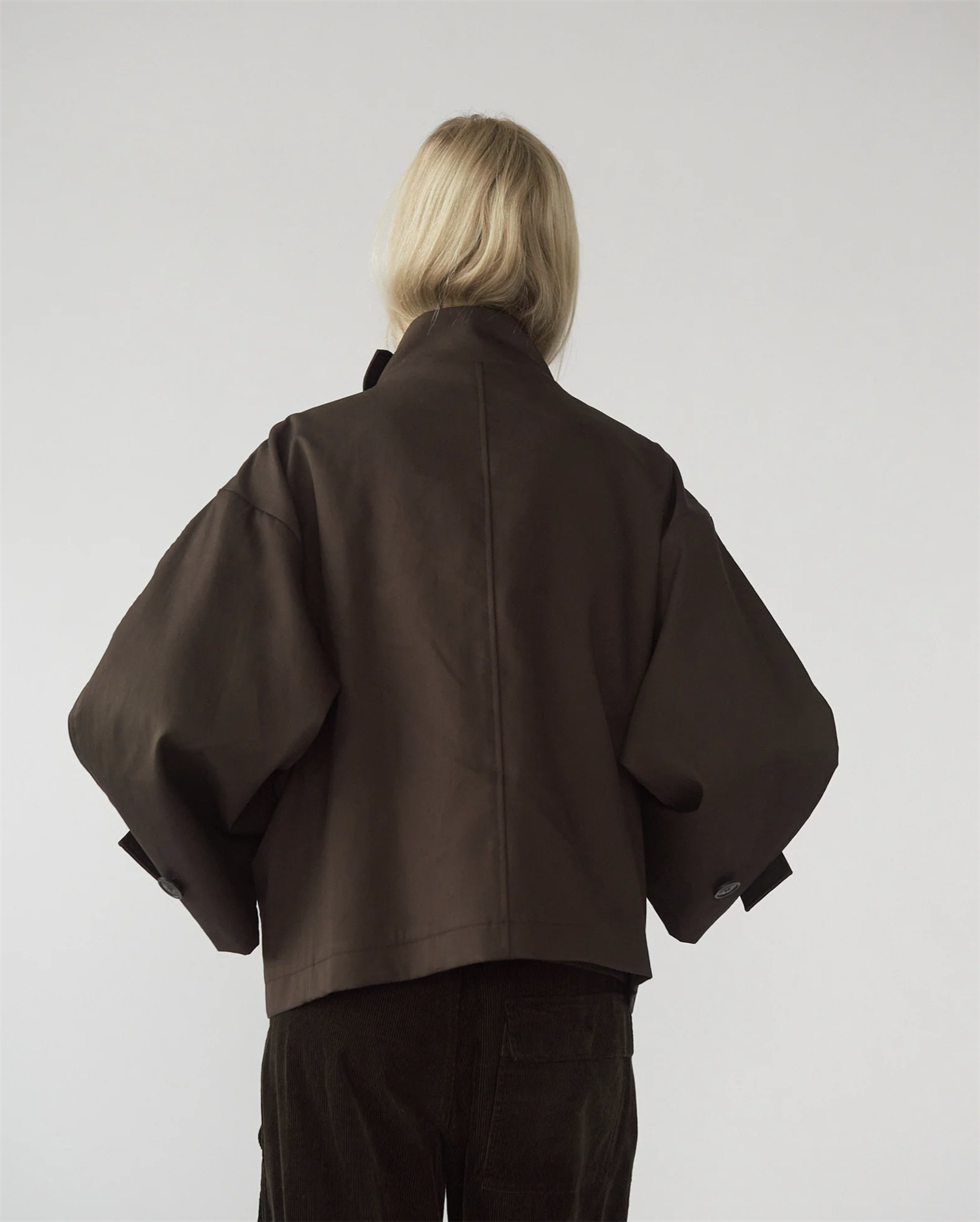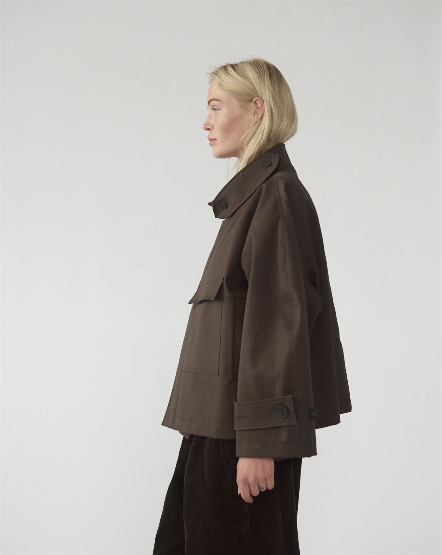 Statement piece du ser gatelangs i Køben. Kul, oversized kort jakke som tåler regn, og som har utrolig fine detaljer i krage, og med de høye lommene. Ermene er vide og hele plagget er bare magisk fint!