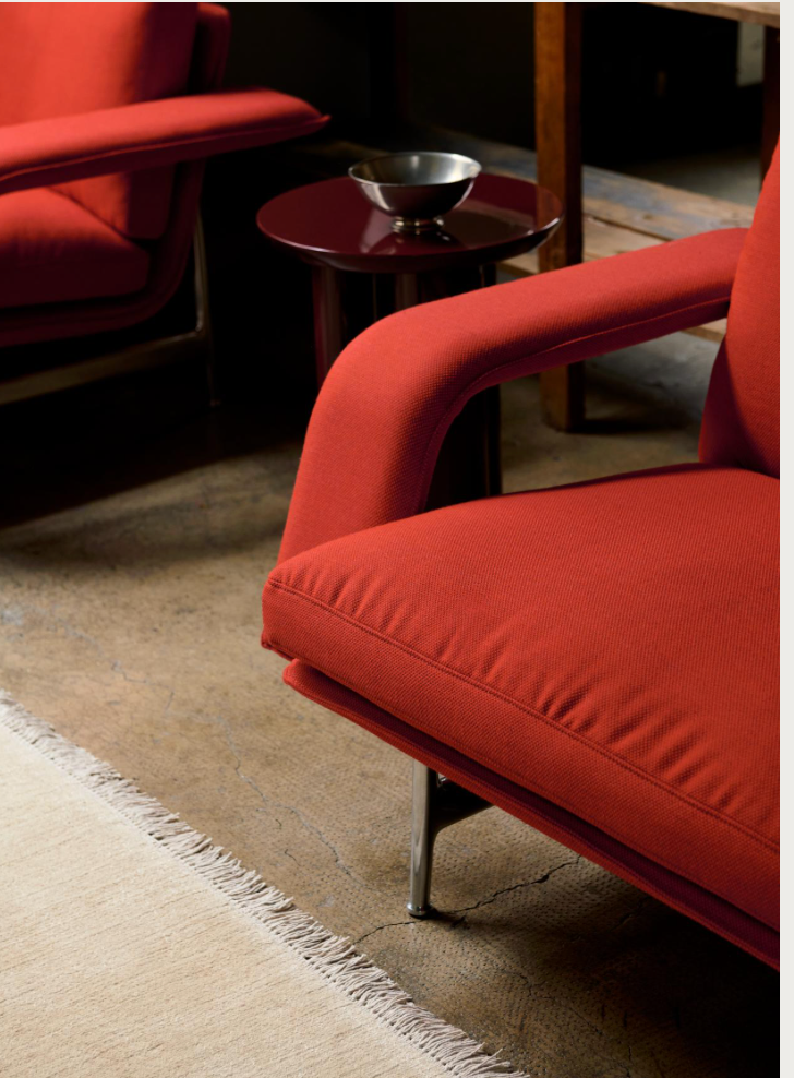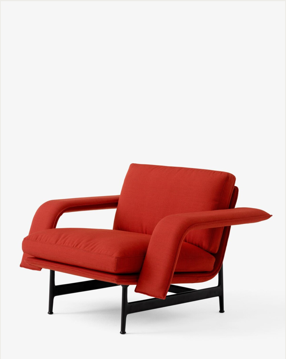 The plywood frame is upholstered with foam and a textile cover. The upholstered cushions are made from HR foam with duvets filled with silicone fibres, which are attached to the frame with velcro. The armrests are made from steel wrapped in hard foam and attached to the frame using a bolt connection. The legs are made from cast aluminium which is either polished or powder-coated.