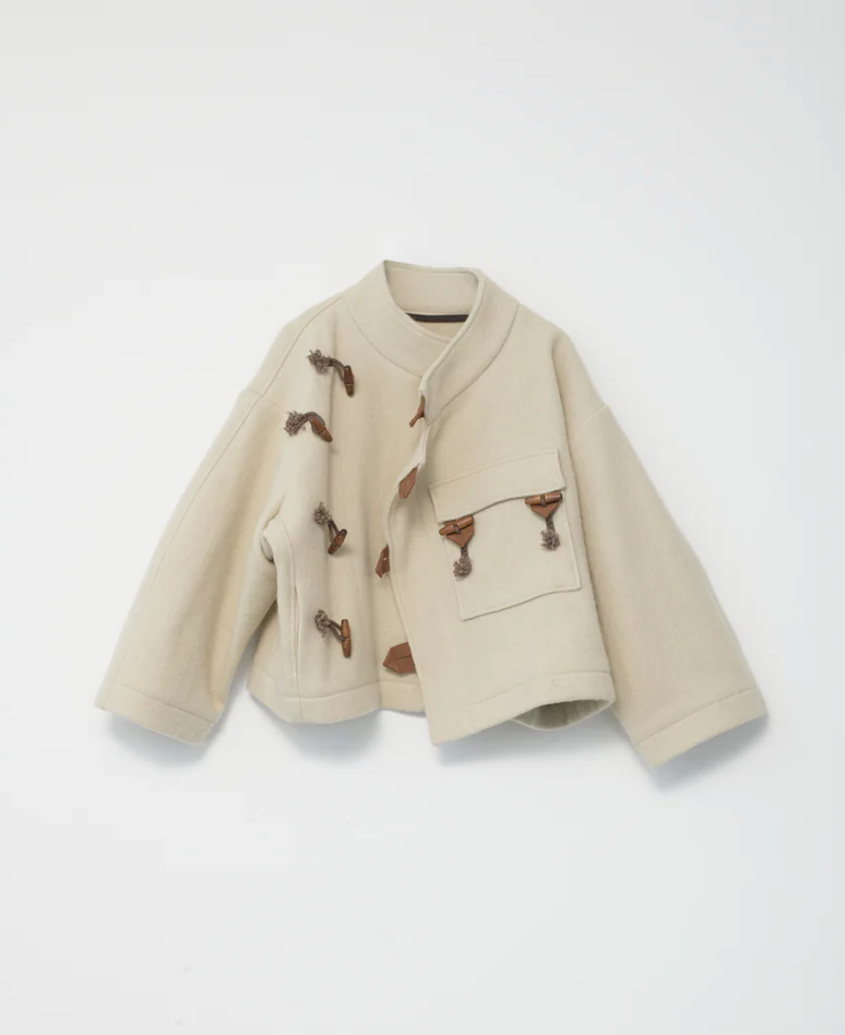 KLIPPAN BOILED WOOL JACKET WITH ASYMMETRICAL WOOD TOGGLES CLOSURE, A LARGE FRONT POCKET AND TWO SIDE POCKETS.