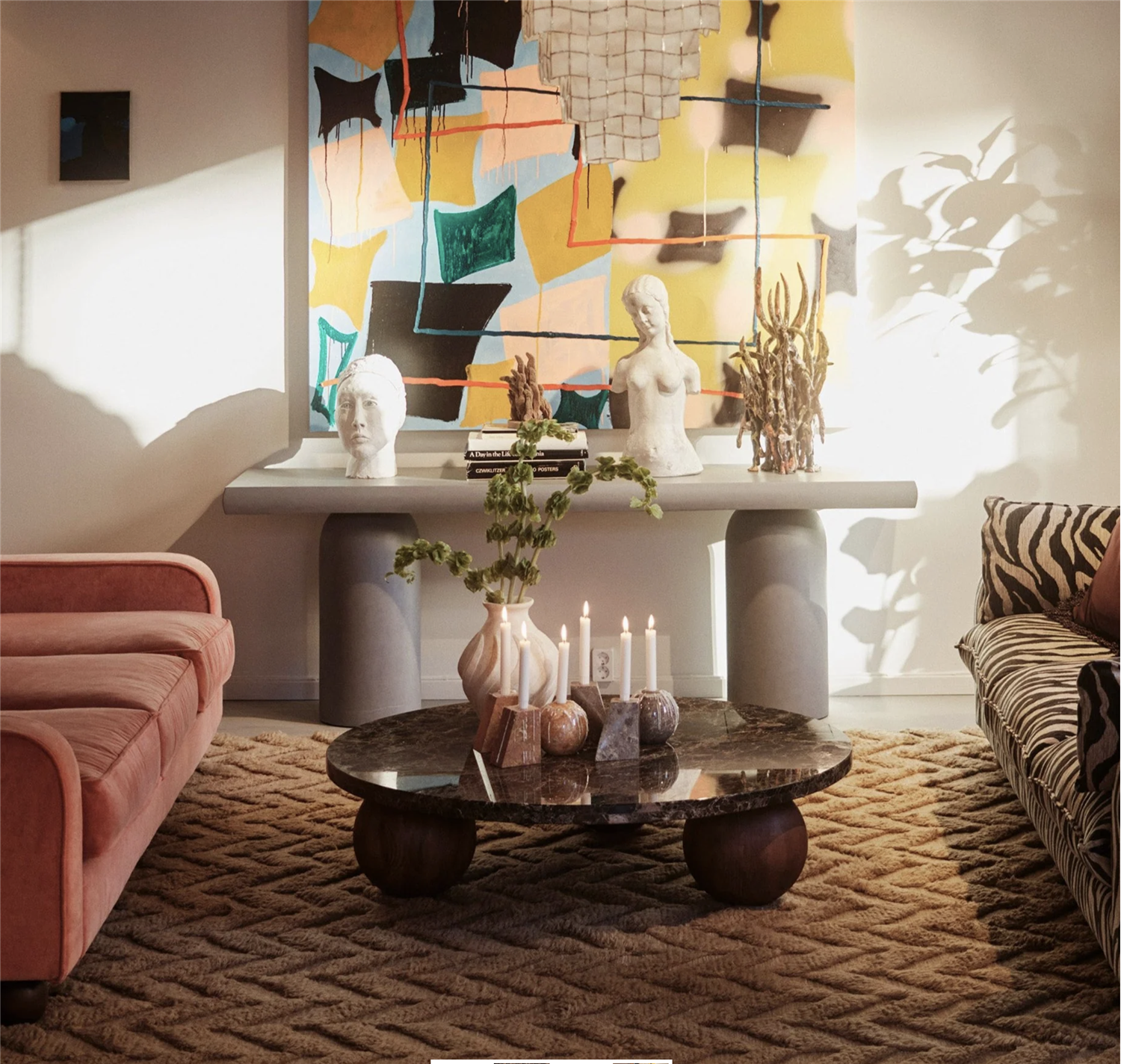 Sphere Round Sofa Table är ett soffbord med en design både enkel och komplex. De överdimensionerade sfärerna av mörkbetsad bok stödjer en massiv bordsskiva i travertinmarmor. Toppen är 5 cm och har en vit nyans med och några ljusare toner i marmorering. Eftersom marmor är ett naturmaterial är varje skiffer unik och med skillnader i struktur och färg. Det runda soffbordet Sphere finns i två storlekar, 100 och 120 cm i diameter. I samma serie presenteras även en fyrkantig version.