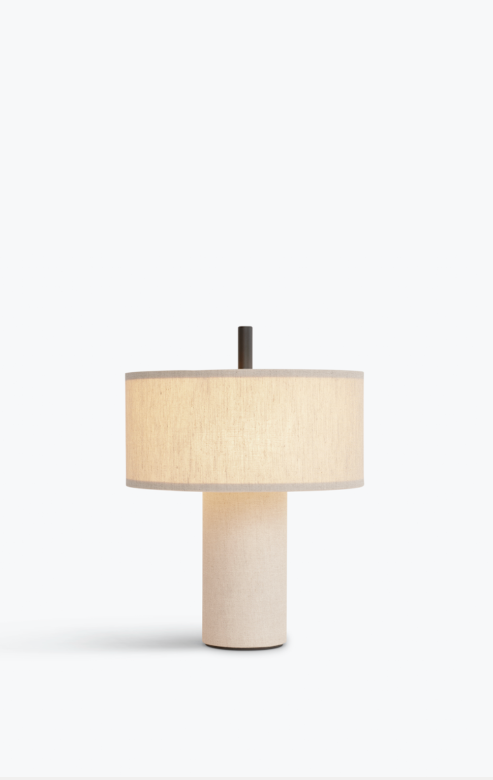 The Margin Portable Table Lamp combines natural linen fabric with a diffusing material to ensure an even distribution of light. At the bottom of the shade, an opal diffuser enhances downward light output. A steel tube is attached at the top of the shade to hold the top plate in position.
