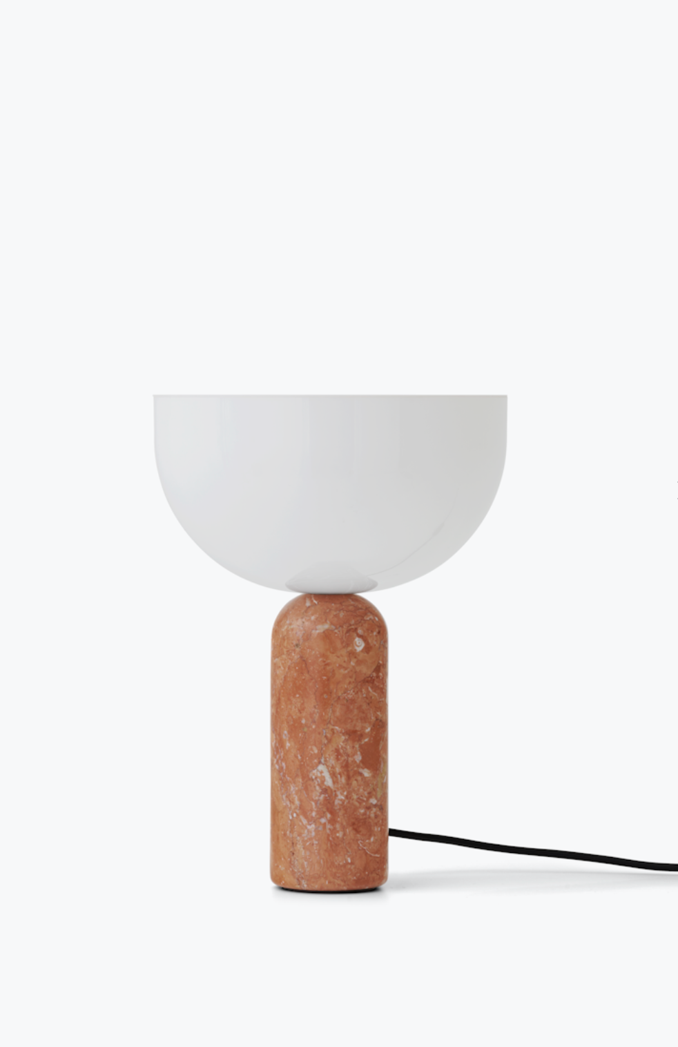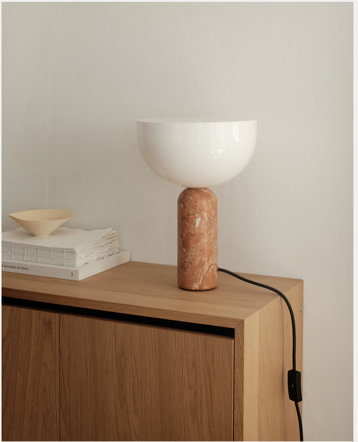 The Kizu Family transforms with new additions featuring Kunis Breccia Marble, a natural stone characterised by its medley of scattered mineral fragments and gentle colours. Its raw beauty is countered by the polished finish and high-white shades, with the creamy colour tones delivering a soft interpretation of the iconic “kiss”; the precise meeting of the lamp’s two sculptural shapes. The entire Kizu family – the Kizu Table Lamp in small and large and Kizu Portable Table Lamp – now shines with the subtle attitude and timeless perspective of this new material meeting.