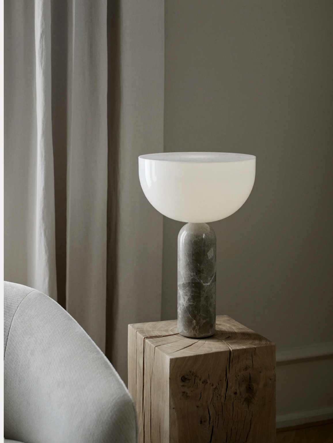 The Kizu Family transforms with new additions featuring Kunis Breccia Marble, a natural stone characterised by its medley of scattered mineral fragments and gentle colours. Its raw beauty is countered by the polished finish and high-white shades, with the creamy colour tones delivering a soft interpretation of the iconic “kiss”; the precise meeting of the lamp’s two sculptural shapes. The entire Kizu family – the Kizu Table Lamp in small and large and Kizu Portable Table Lamp – now shines with the subtle attitude and timeless perspective of this new material meeting.