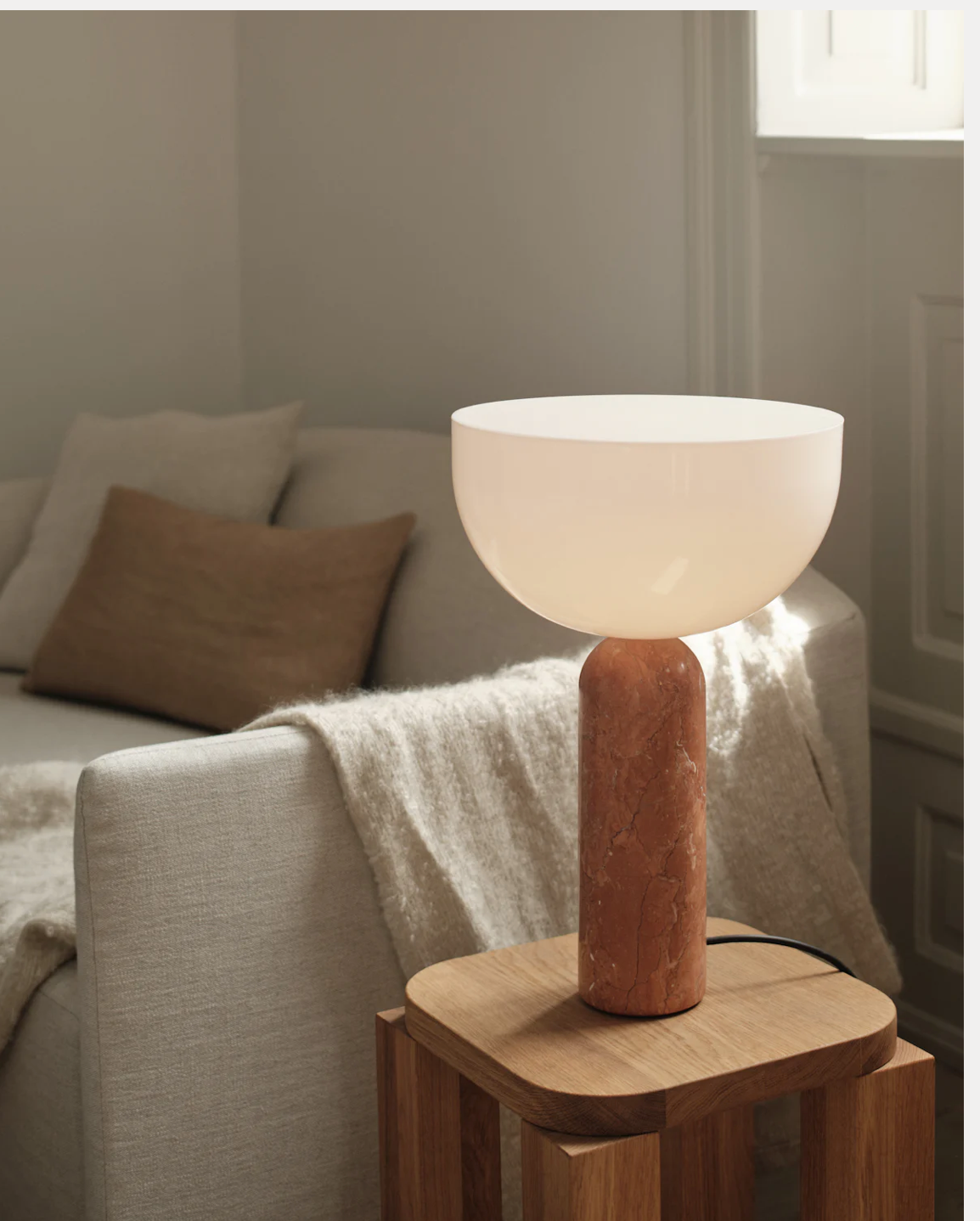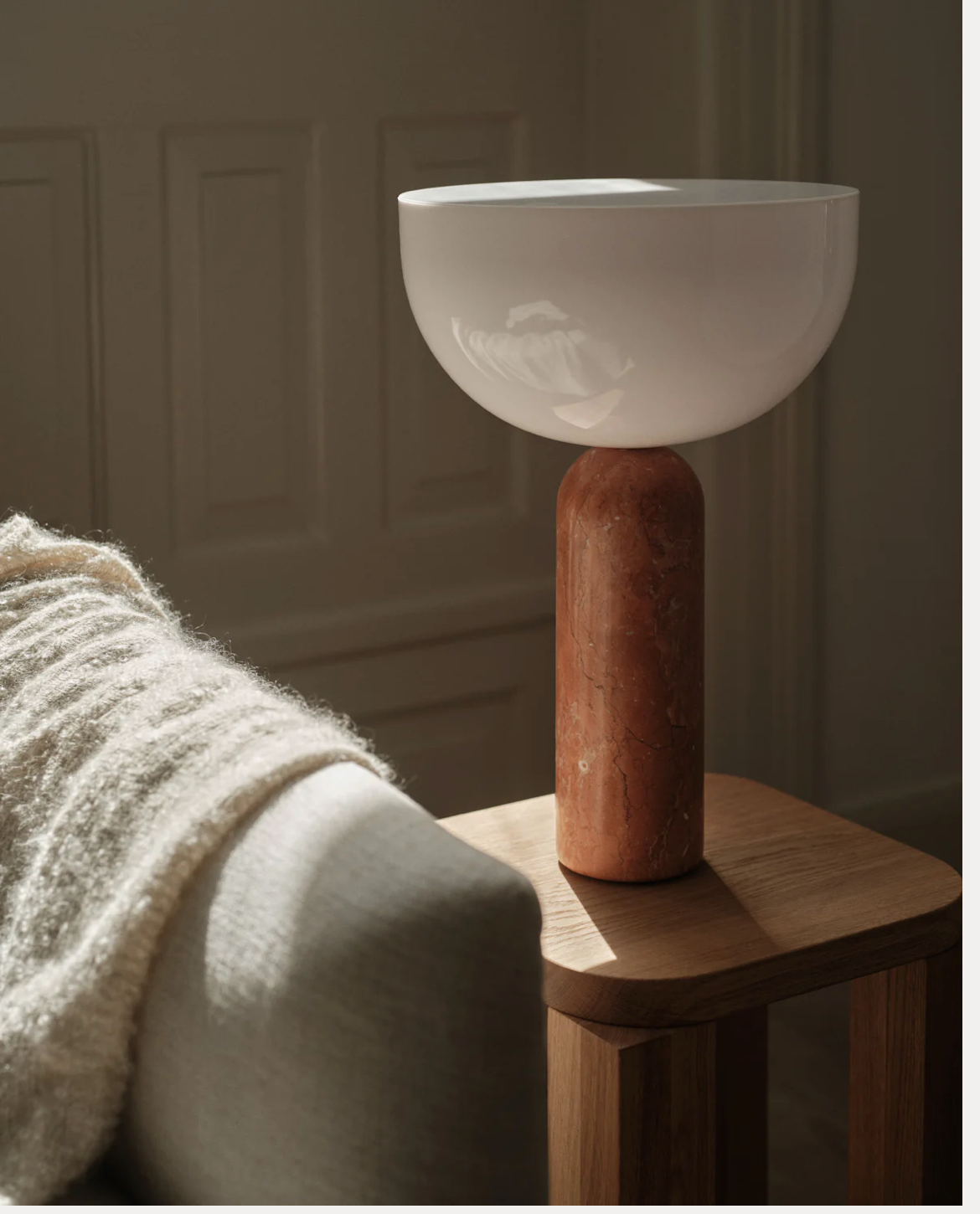 The Kizu Family transforms with new additions featuring Kunis Breccia Marble, a natural stone characterised by its medley of scattered mineral fragments and gentle colours. Its raw beauty is countered by the polished finish and high-white shades, with the creamy colour tones delivering a soft interpretation of the iconic “kiss”; the precise meeting of the lamp’s two sculptural shapes. The entire Kizu family – the Kizu Table Lamp in small and large and Kizu Portable Table Lamp – now shines with the subtle attitude and timeless perspective of this new material meeting.