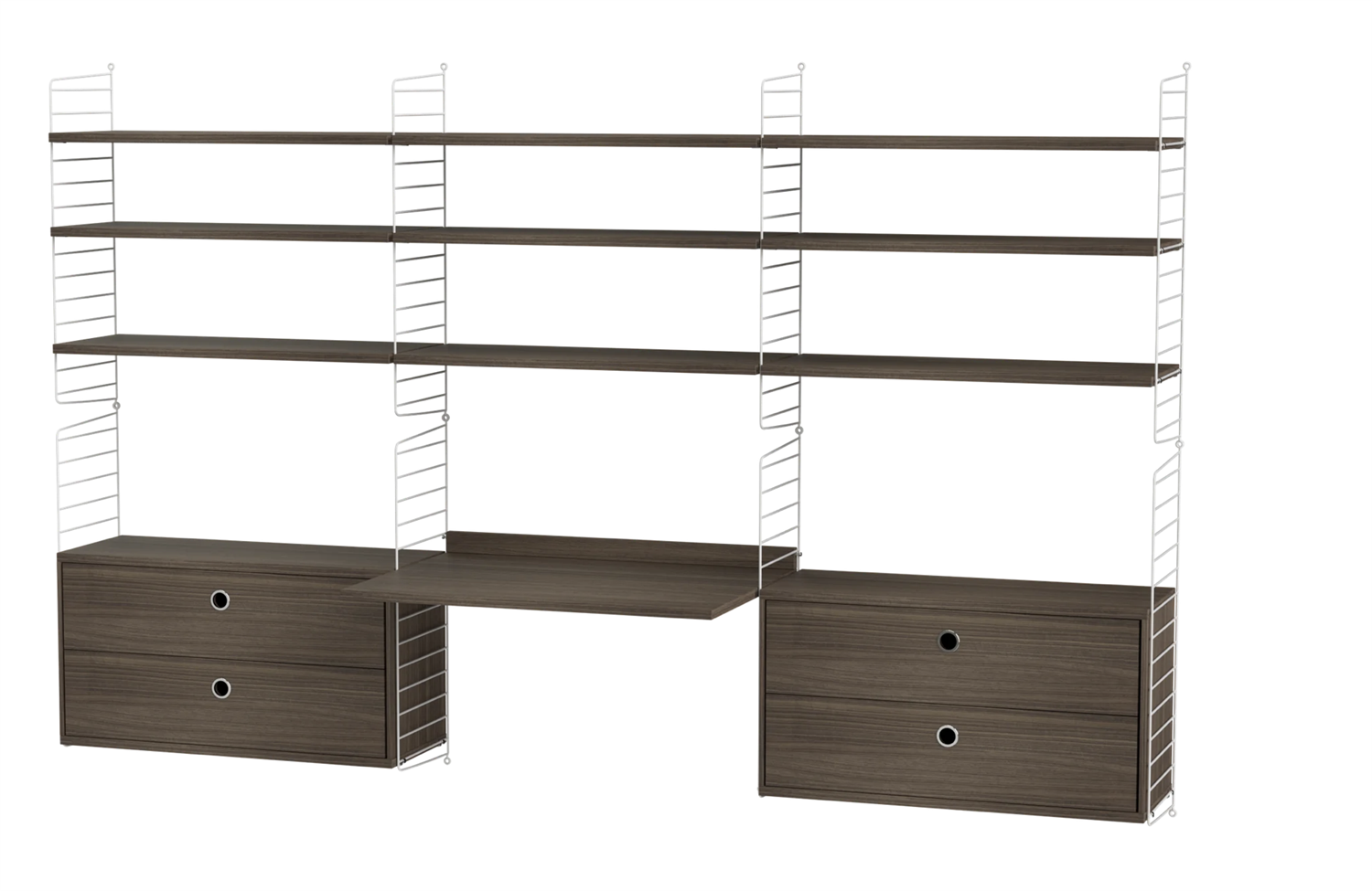 Regardless if your workspace is situated at the office or at home – we have the solution that covers all your needs. For the more spacious workspace we have this wall-hung combination with plenty of shelves, cabinets and a work desk in the middle.