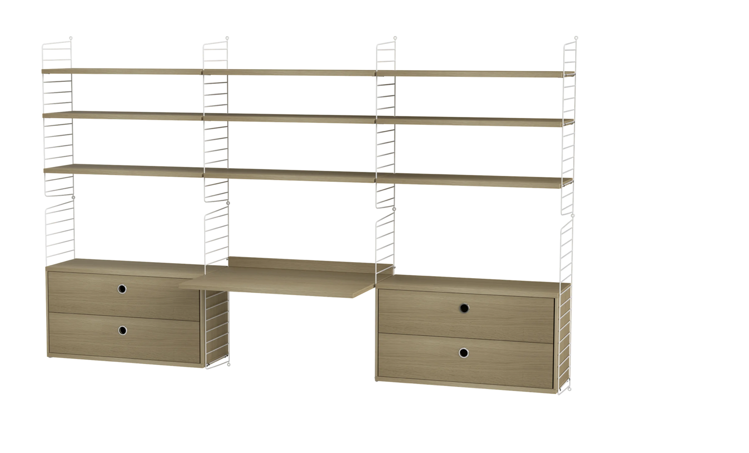 Regardless if your workspace is situated at the office or at home – we have the solution that covers all your needs. For the more spacious workspace we have this wall-hung combination with plenty of shelves, cabinets and a work desk in the middle.
