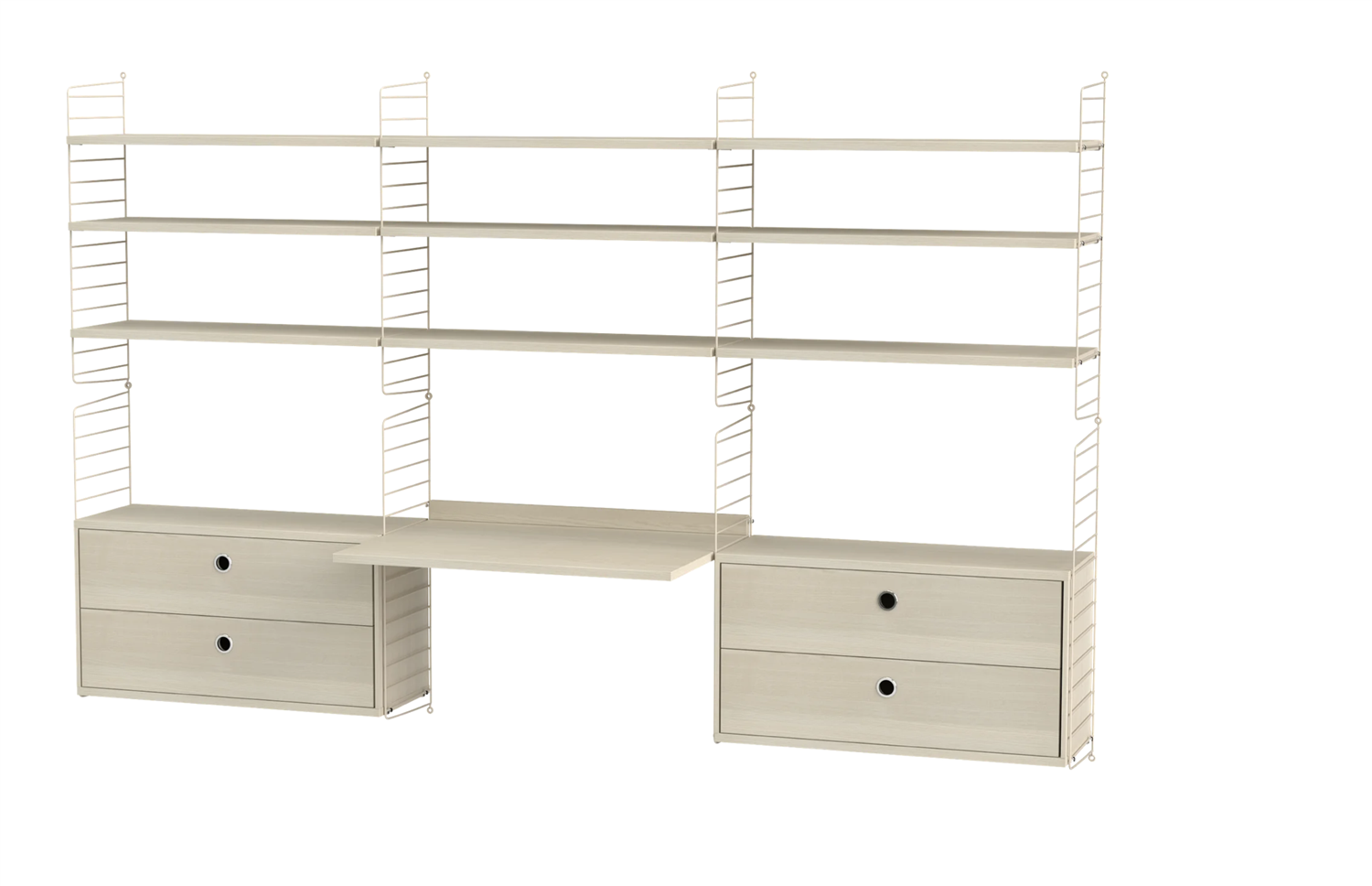 Regardless if your workspace is situated at the office or at home – we have the solution that covers all your needs. For the more spacious workspace we have this wall-hung combination with plenty of shelves, cabinets and a work desk in the middle.