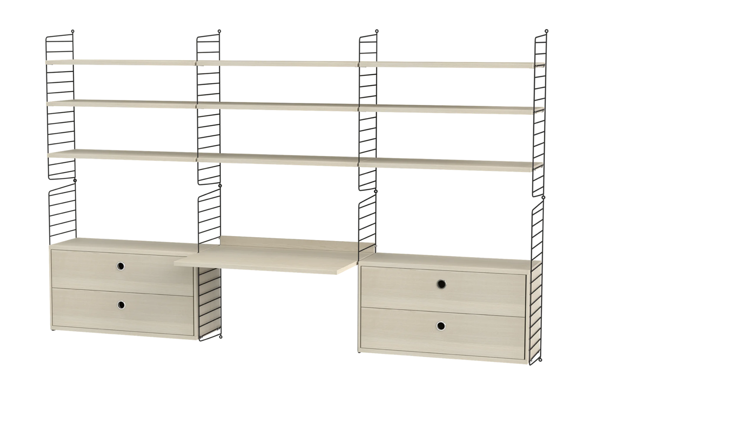 Regardless if your workspace is situated at the office or at home – we have the solution that covers all your needs. For the more spacious workspace we have this wall-hung combination with plenty of shelves, cabinets and a work desk in the middle.