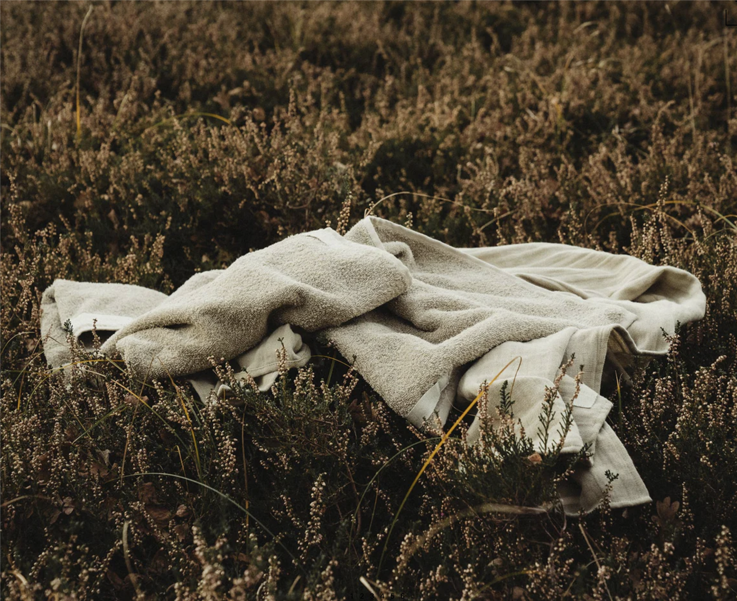 FRAMA Heavy Towels, woven with 30% hemp and 70% organic, GOTS-certified terry cotton, create a warm experience with their textured yet smooth character. Soft and thick, these highly absorbent towels combine natural fibers free from harmful chemicals with double-stitched hems and closed corners. A luxurious size suitable as a large bath or beach towel.