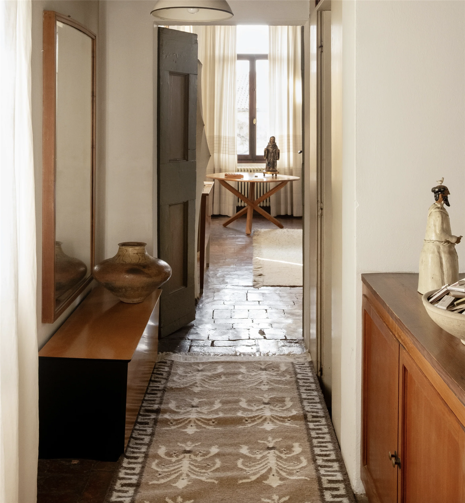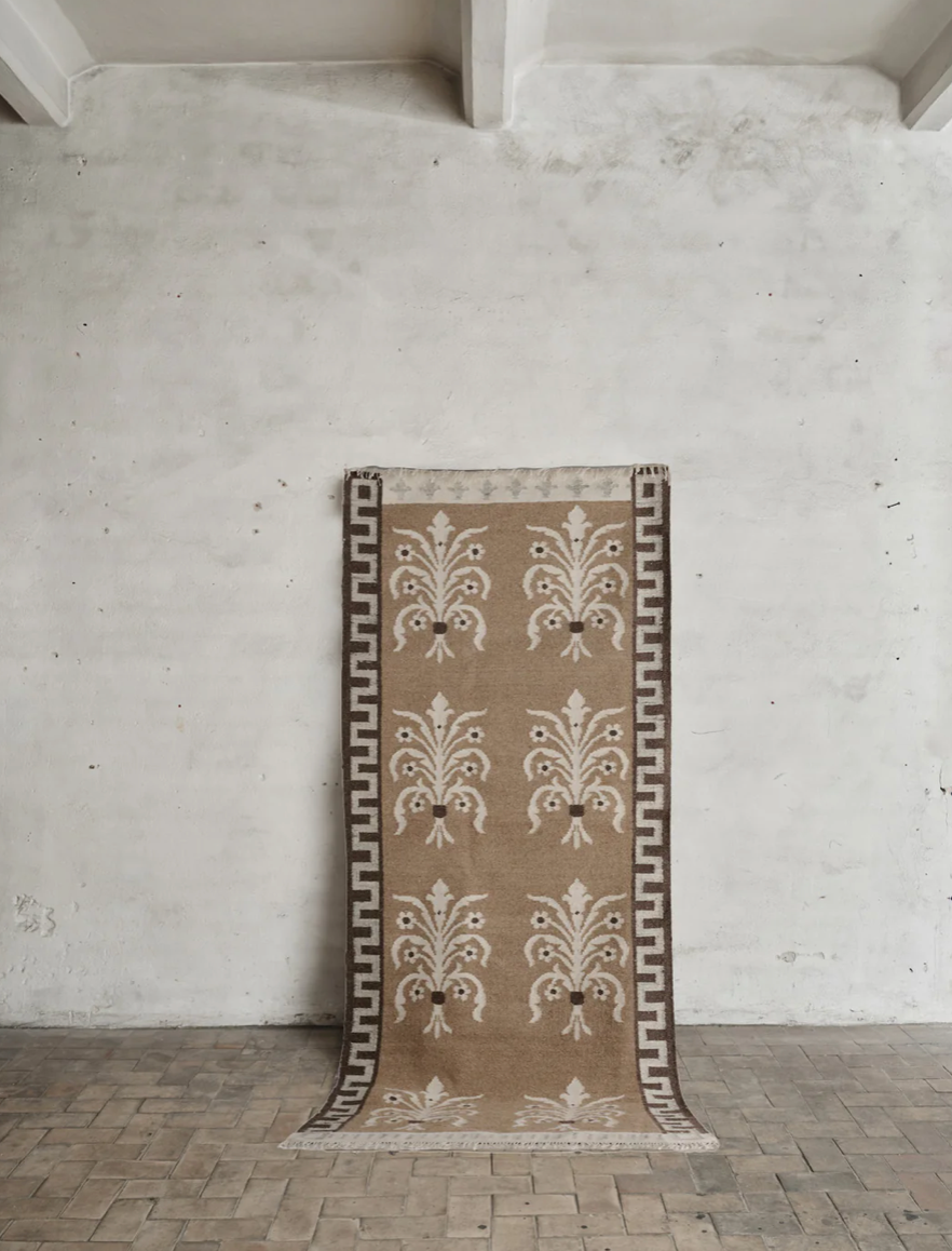 Colonnade no.10 is a hand-woven rug in a soft, sand-brown shade, highlighted by lighter elements in the pattern, evoking a serene yet sophisticated aesthetic. The floral motifs draw influence from decorative wall designs found on traditional buildings in Copenhagen’s historic Frederiksberg district.