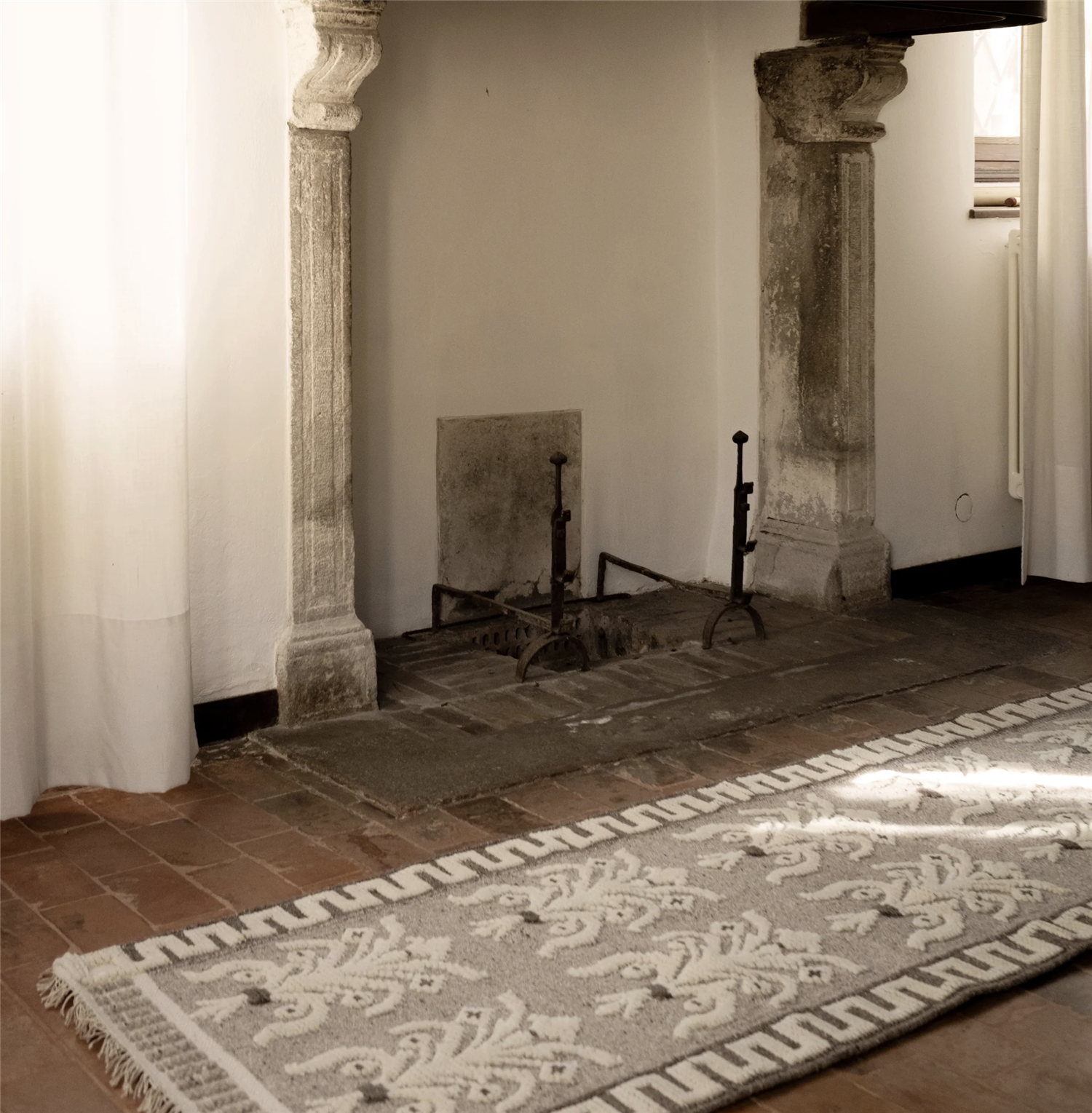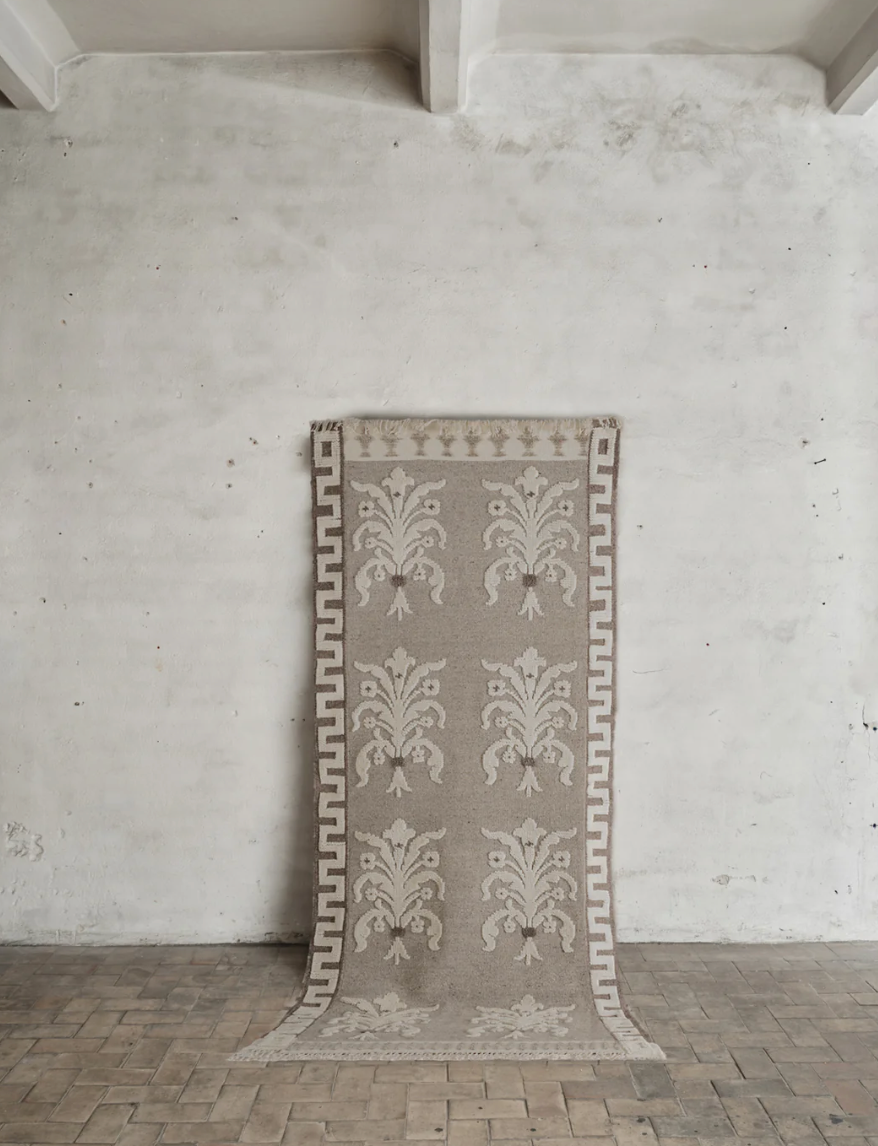 Colonnade no.11 is built on a flat foundation, adorned with hand-knotted motifs, creating a subtle high-low texture. The color palette of no.11 leans toward cooler tones, with light grey as the dominant hue, lending it a modern and refined look.