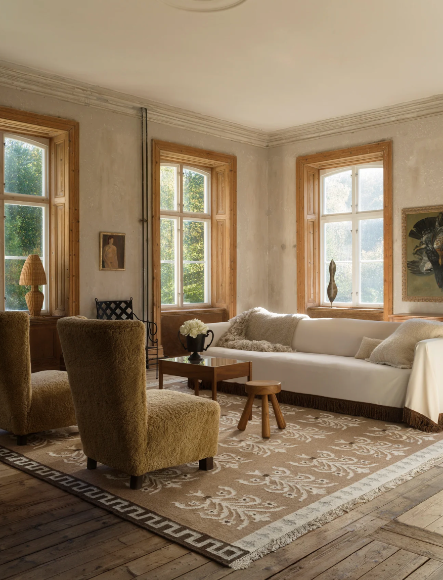 no. 24 is made in a soft, sand-brown shade, highlighted by lighter elements in the pattern, evoking a serene yet sophisticated aesthetic. The floral-inspired motifs draw influence from decorative wall designs found at the entrances of traditional buildings in Copenhagen’s historic Frederiksberg district.
