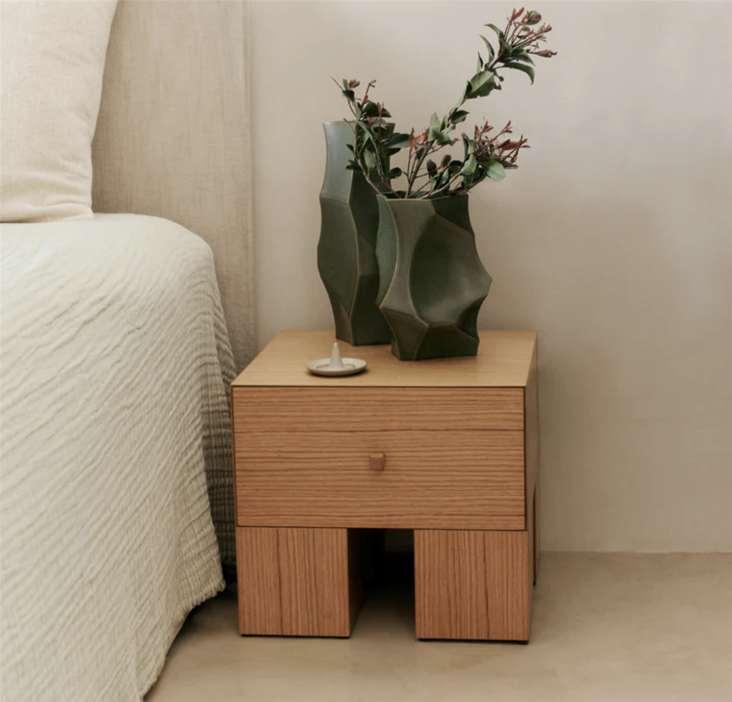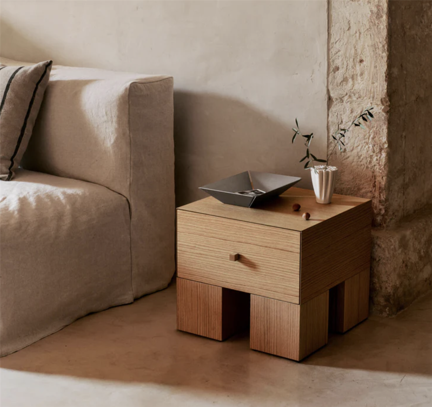 The Kuben Bedside Table is crafted from FSC™-certified natural oak veneer. Its sharp, cubic form and mitred joints craft the illusion of a seamless box, while the oversized cube-shaped feet introduce a bold character. Delicate handles introduce a refined touch, enhancing the design's playful intrigue. Seamlessly blending functionality and a minimalist aesthetic, it provides ample storage and a modern look, ideal for various settings.