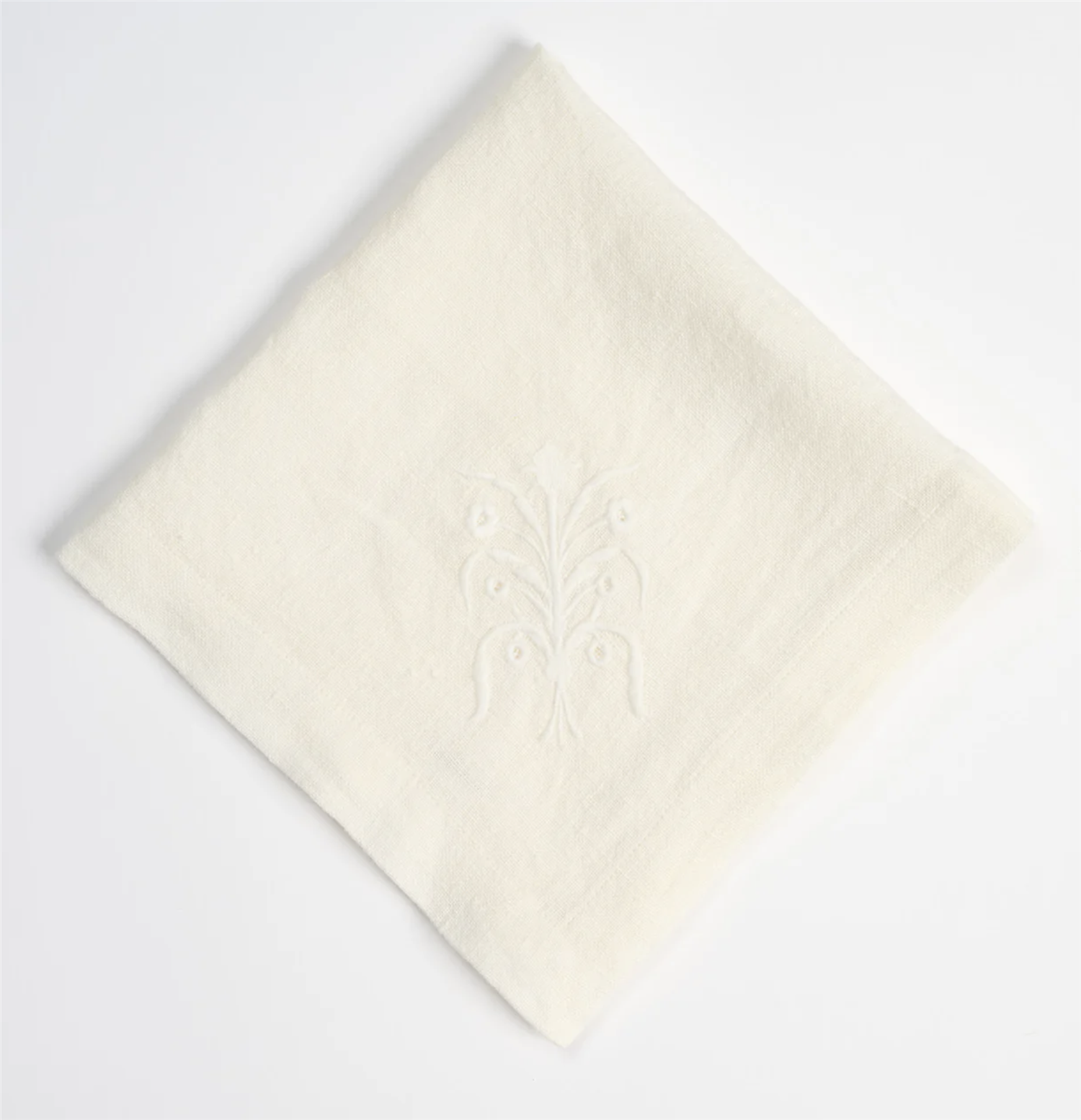 Floral Linen Napkin in white is crafted from 100% linen. Each napkin features a beautifully embroidered flower in one corner, while the tablecloth is decorated with embroidered flowers, all over.