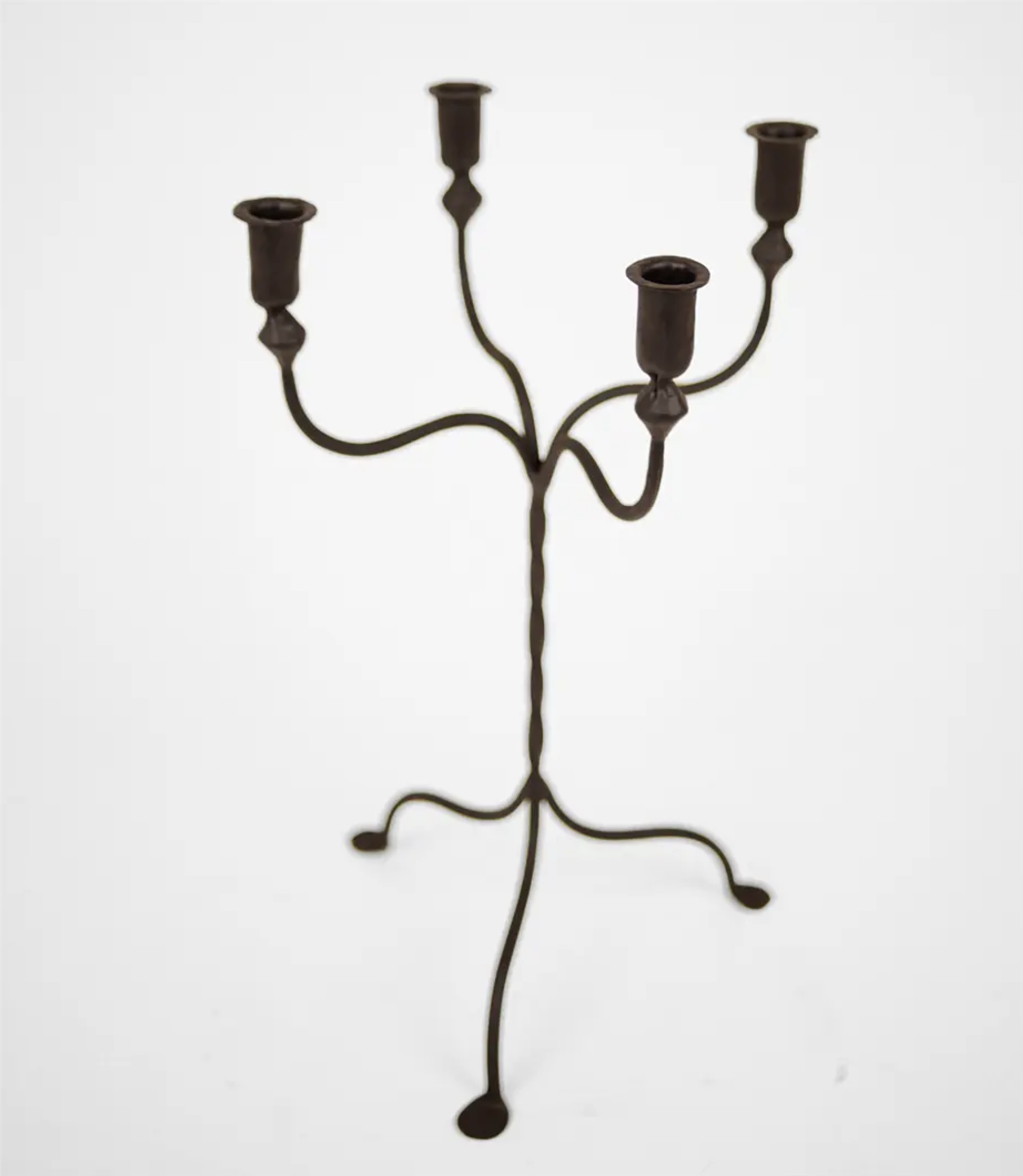 Charmigt svängd ljusstake i järn med fyra armar. Den lekfulla silhuetten och rustika finishen ger ett elegant uttryck med en twist.