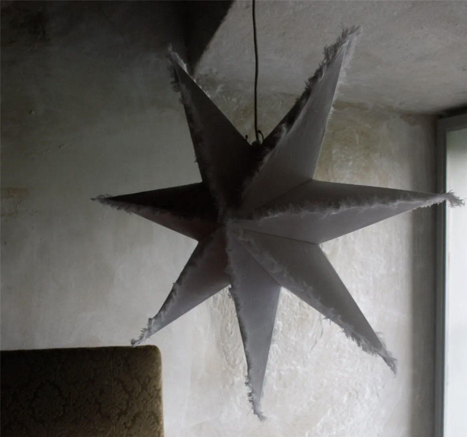 En vacker adventsstjärna i unik design. Kanterna omges av fransar från linnetyget som ger en varm och mysig känsla. Anslutningskabel i tyg och lampfäste med E14 sockel ingår.
