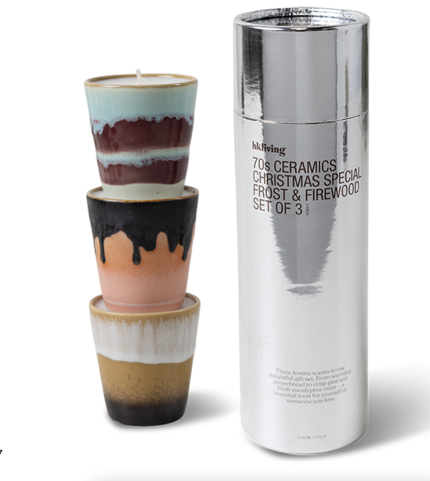 The ultimate gift for the scent lover: three mini candles in our signature 70s ceramics ristretto mugs. Each candle brings a festive fragrance—gingerbread, winterwoods, and frosted leaves—in a small but striking size. And when they’re empty? You’ve got three ristretto mugs ready to use. The gift that keeps on giving.