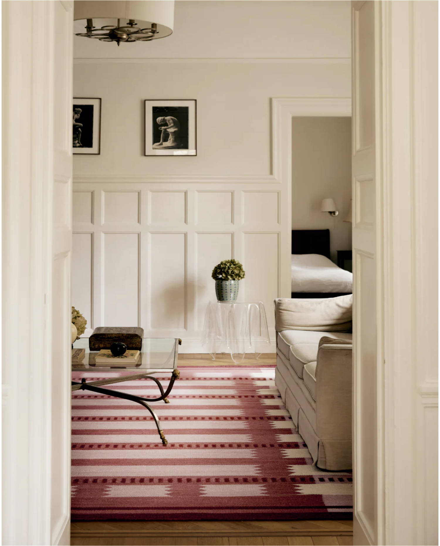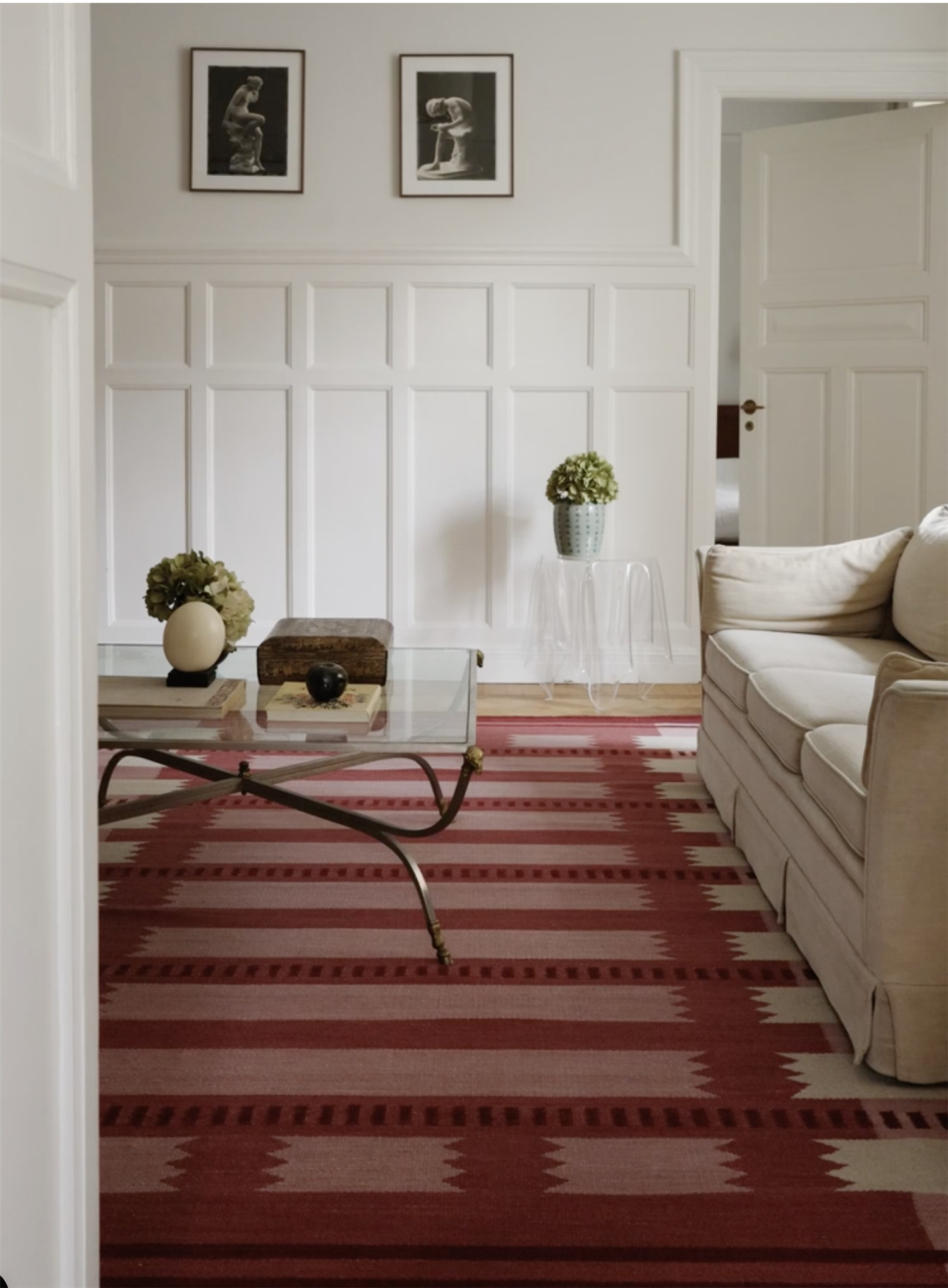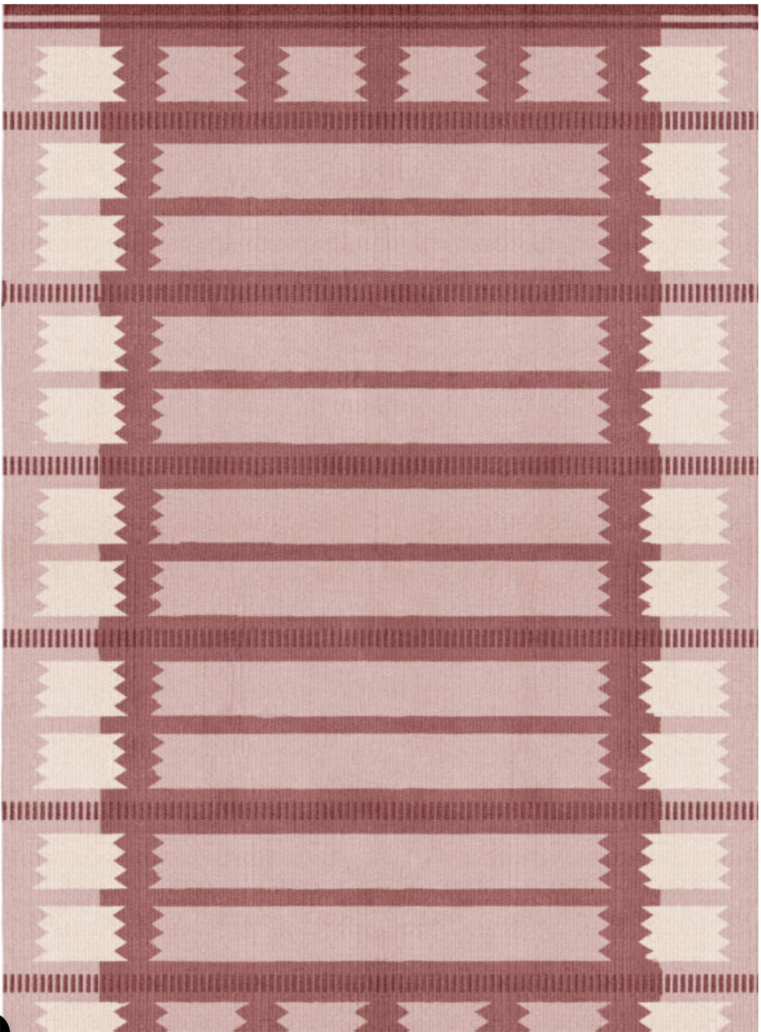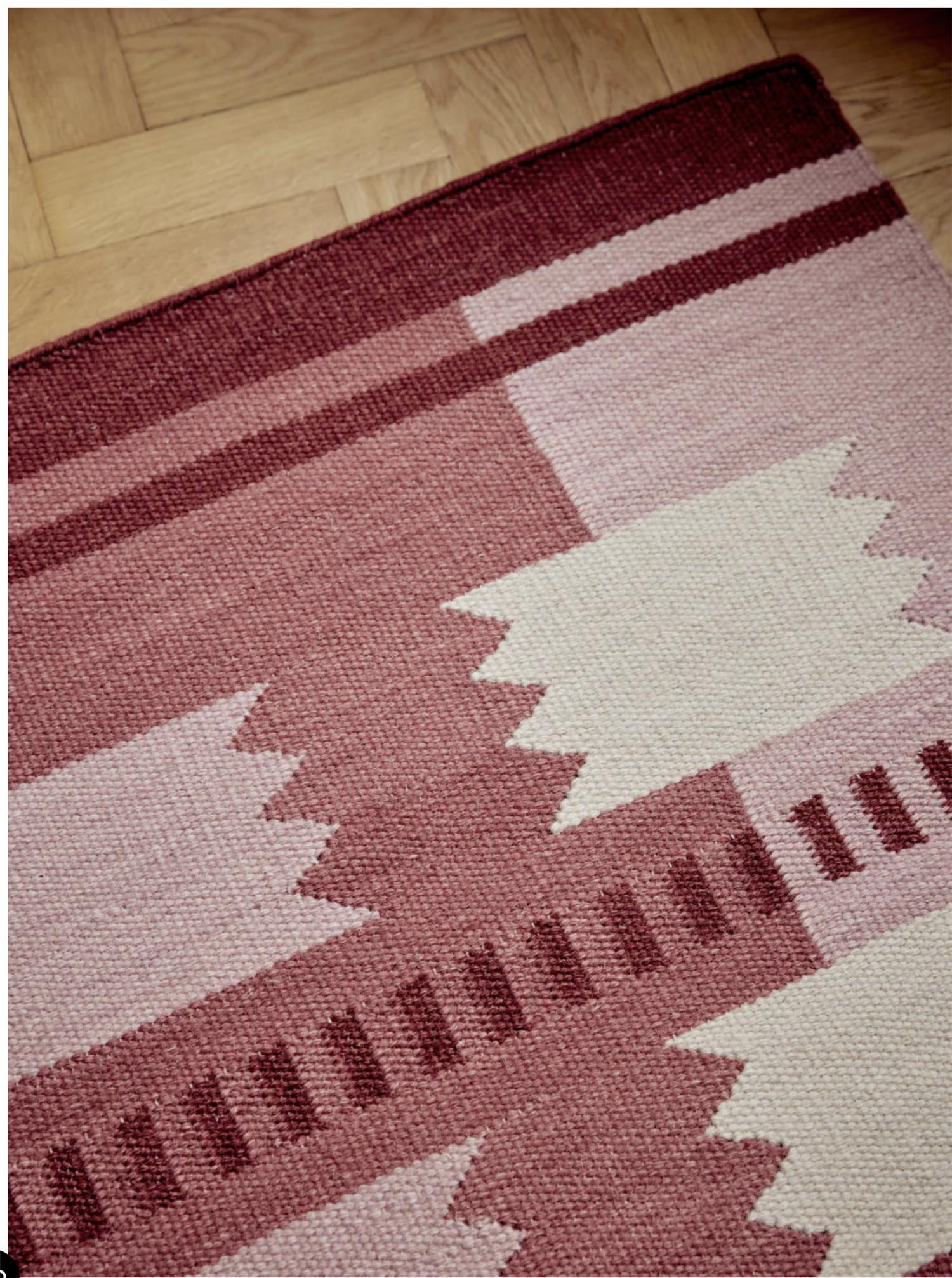 Röllakan: En kolleksjon som hyller det skandinaviske, kvinnelige tradisjonshåndverket og det klassiske röllakan-teppet, med inspirasjon av svenske folketradisjoner og tolket i et moderne uttrykk. Hvert teppe er håndvevd, der mønsteret er i 100% ull og basen i 100% bomull.