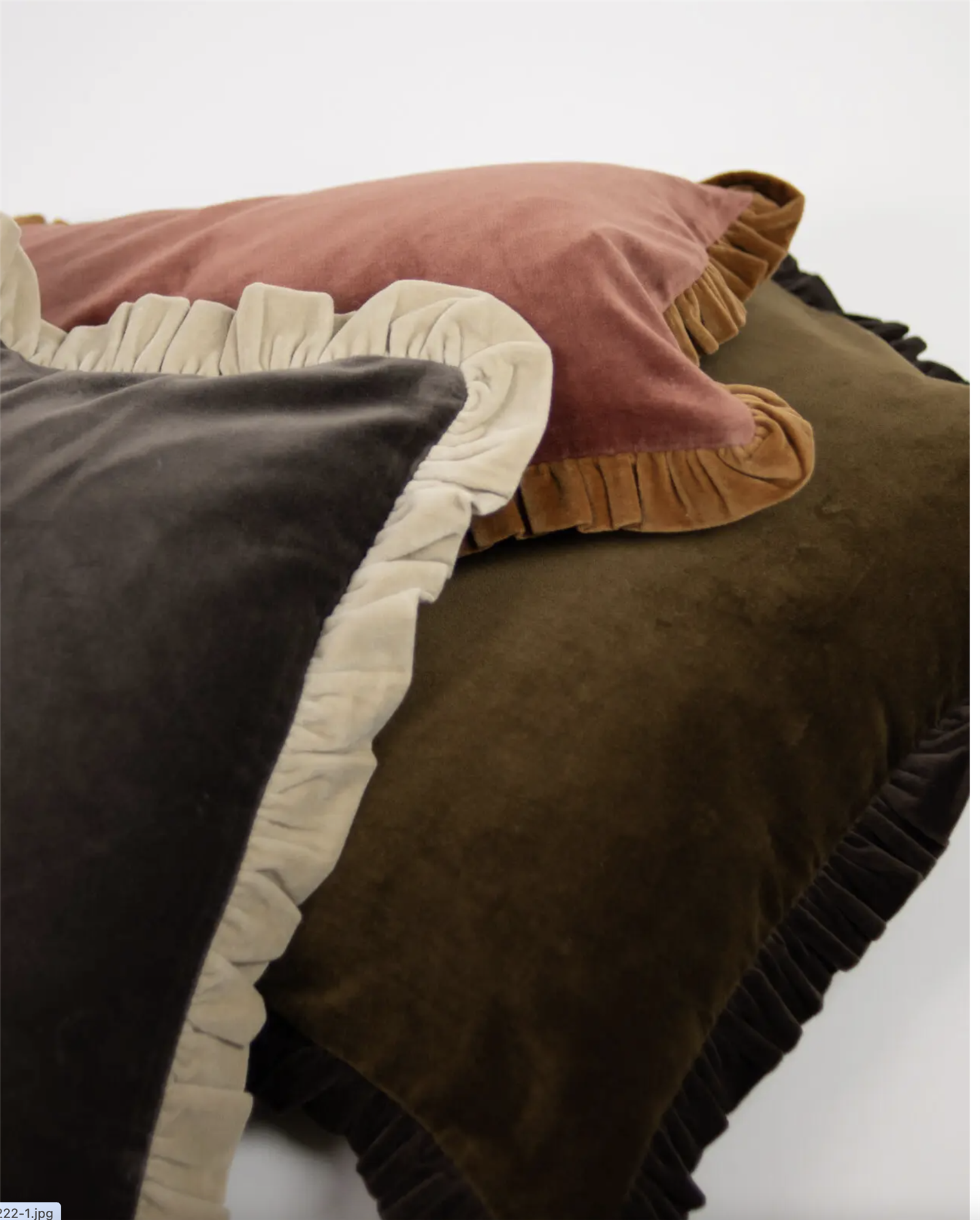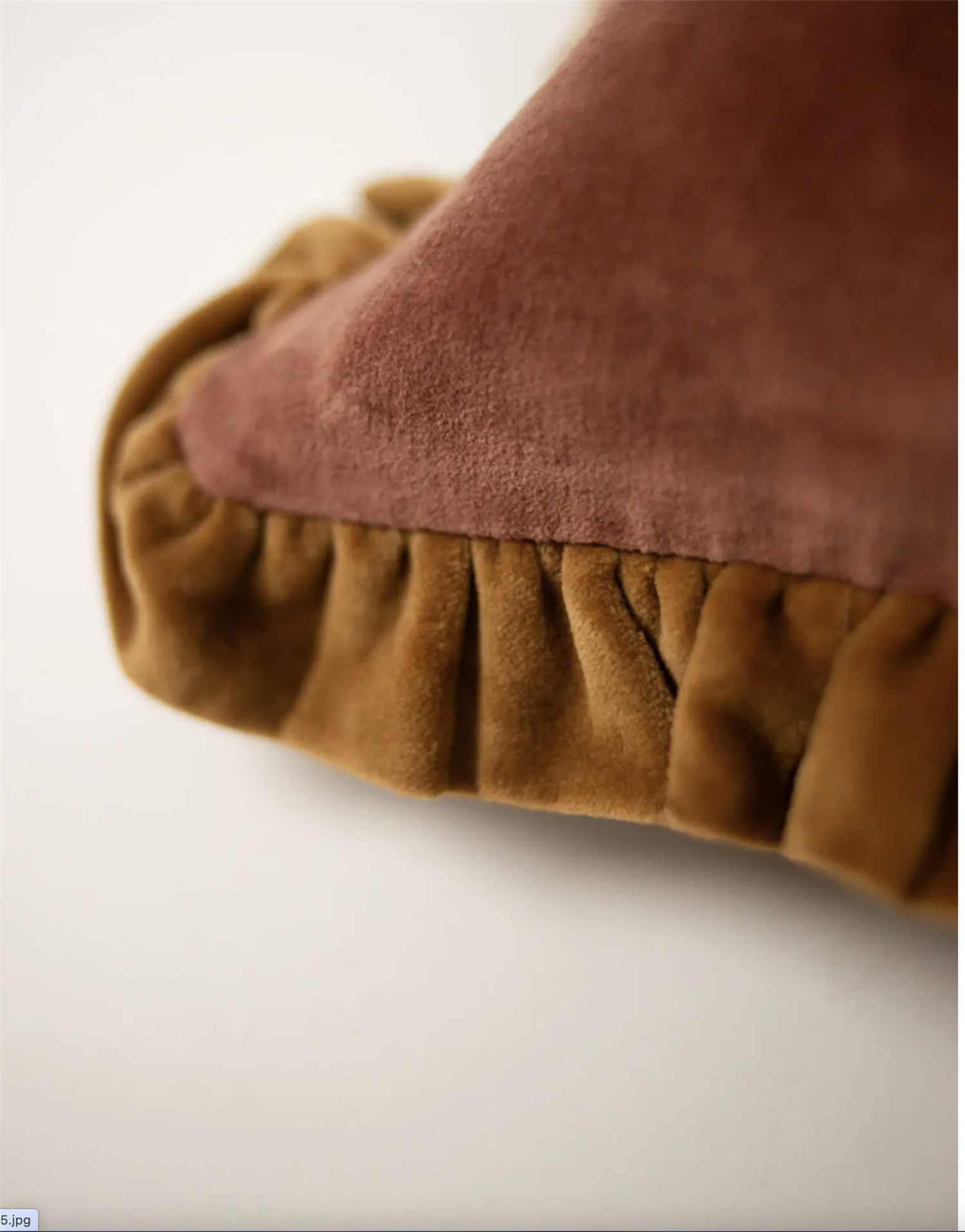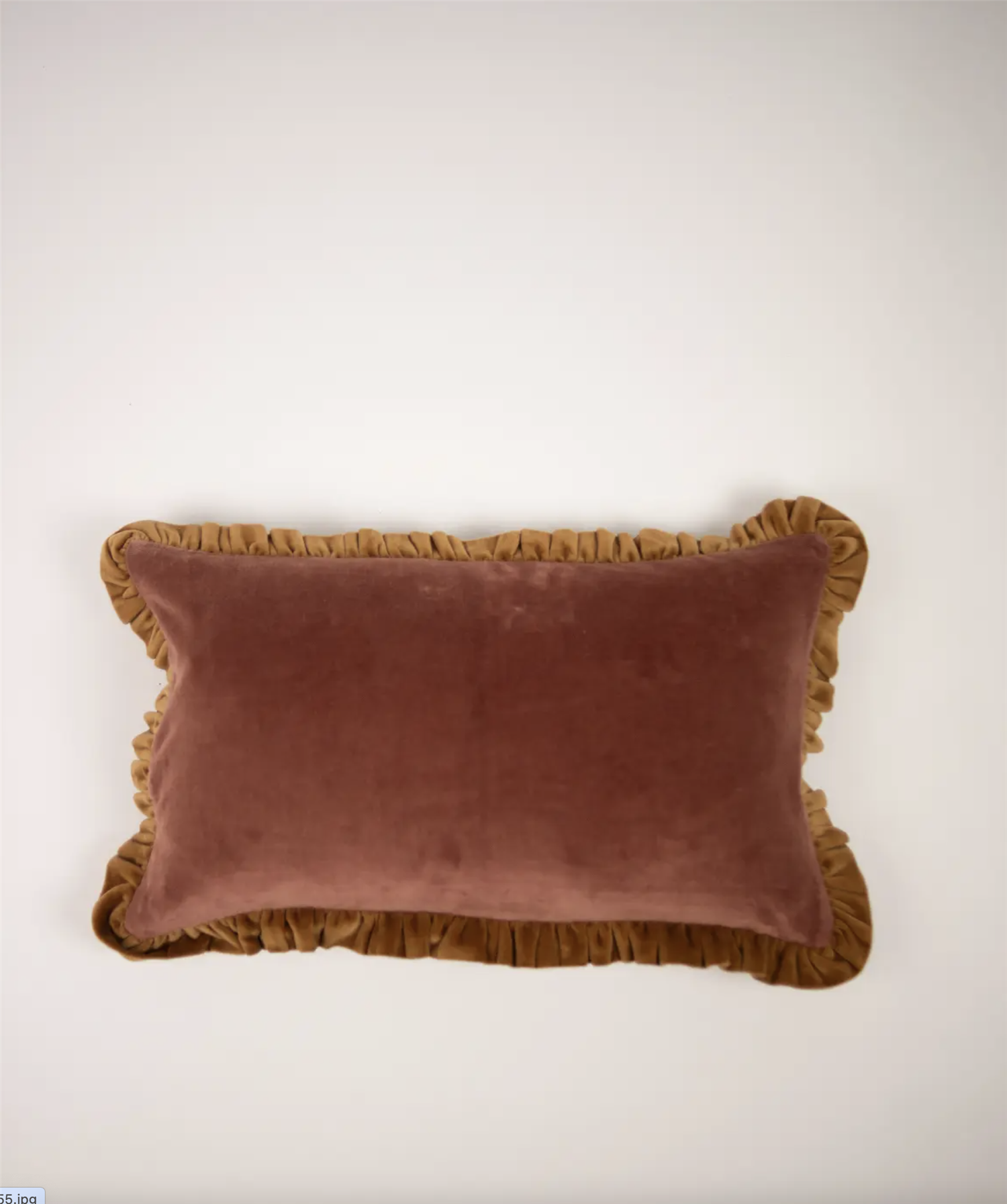 En pyntepute i velur med volanger .Fargen er i rustrosa og volangene i kamelfarga. Størrelsen er 30x50 cm