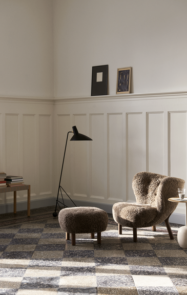 En minimalistisk gulvlampe i lakket stål.