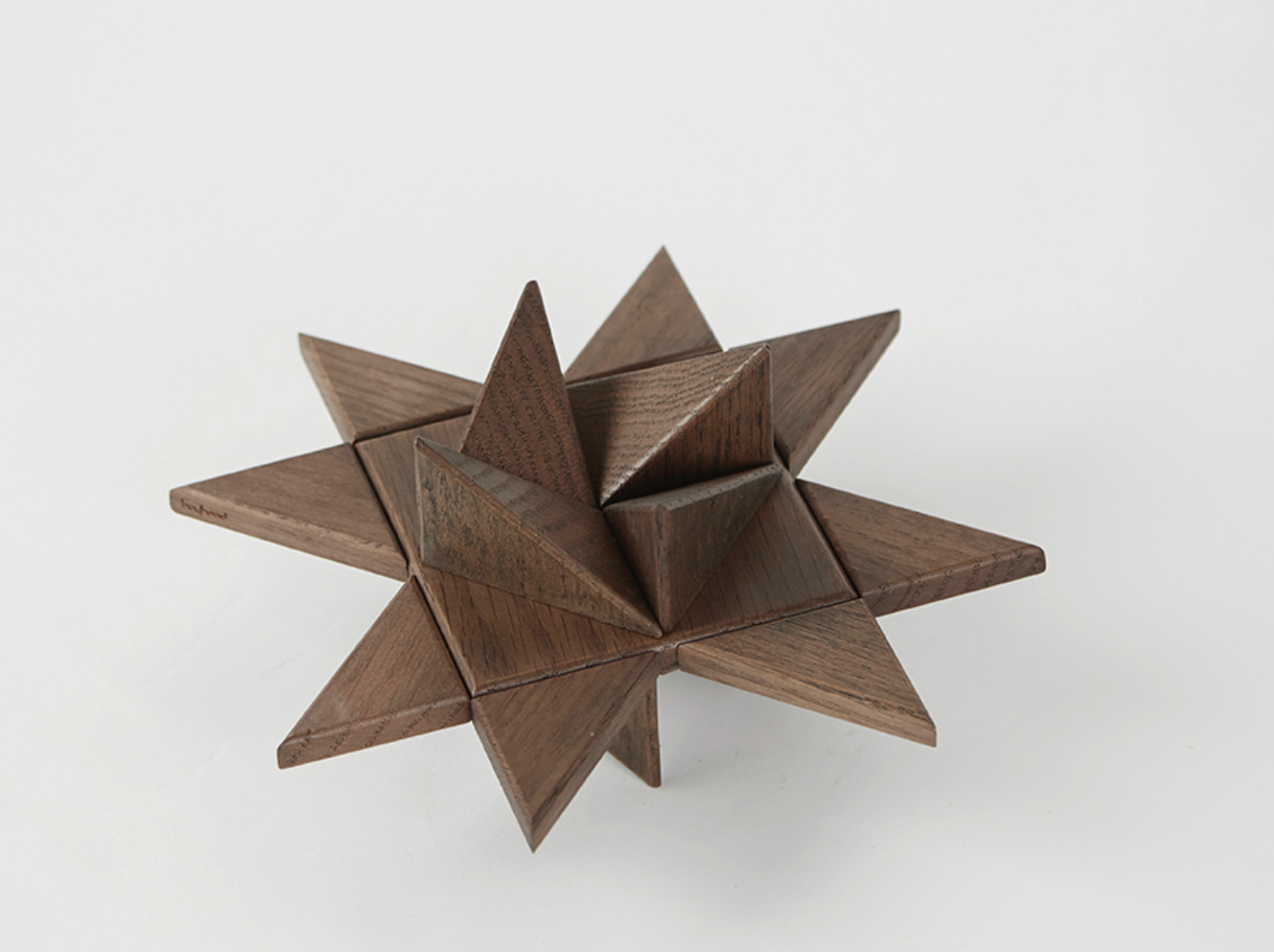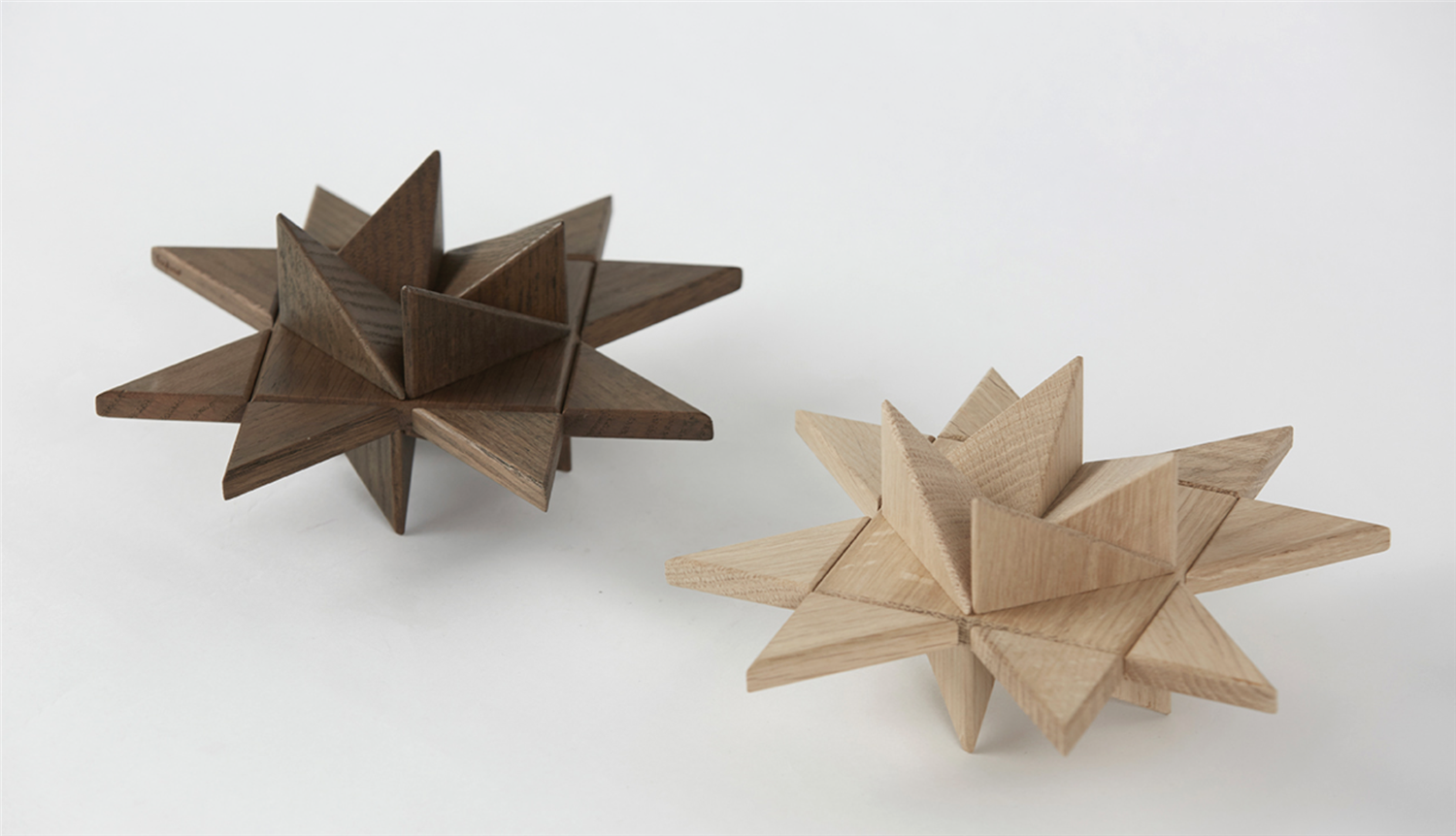 Stjernen er nu blevet til et lysende minde om barndommens juleglæde – her udført i egetræ, som med sine bløde kanter finder sin naturlige plads i vindueskarmen eller på julebordet.