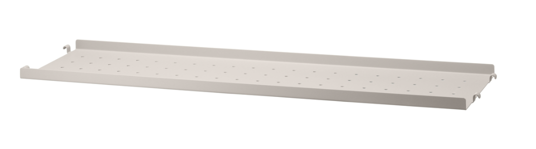 The metal shelves with low edge are available in two widths, 58 and 78 cm, along with two depths, 20 and 30 cm. The shelves are easy to move around and fit into wire and plex panels from String® System if the shelves and panels have the same depth. The 2 cm high edge makes the shelves blend right into a shelving combination with wooden shelves. The perforated shelves are the optimal base to be creative with our accessories. Add hooks, rods, or hanger racks to design your own unique shelf. Each packaging contains one metal shelf.