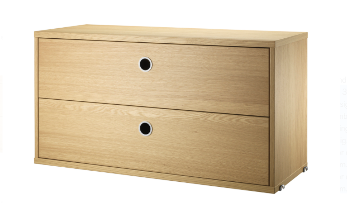 The chests of drawers are available in two widths, 78 and 58 cm, and one depth, 30 cm. The chests of drawers fit into all 30 cm deep wire and plex panels from String® System. They are designed with two drawers to offer hidden storage in your shelving combination. The chests of drawers are a great fit in either the hallway, living room or kids’ room where the need for hidden storage often is big. Chest of drawer w58 x d30 x h42 cm has internal dimensions (for each drawer) depth 23.7 cm, width 51.3 cm and height 16 cm. Chest of drawer w78 x d30 x h42 cm has internal dimensions (for each drawer) depth 23.7 cm, width 71.3 cm and height 16 cm. The chests of drawers are delivered unassembled.