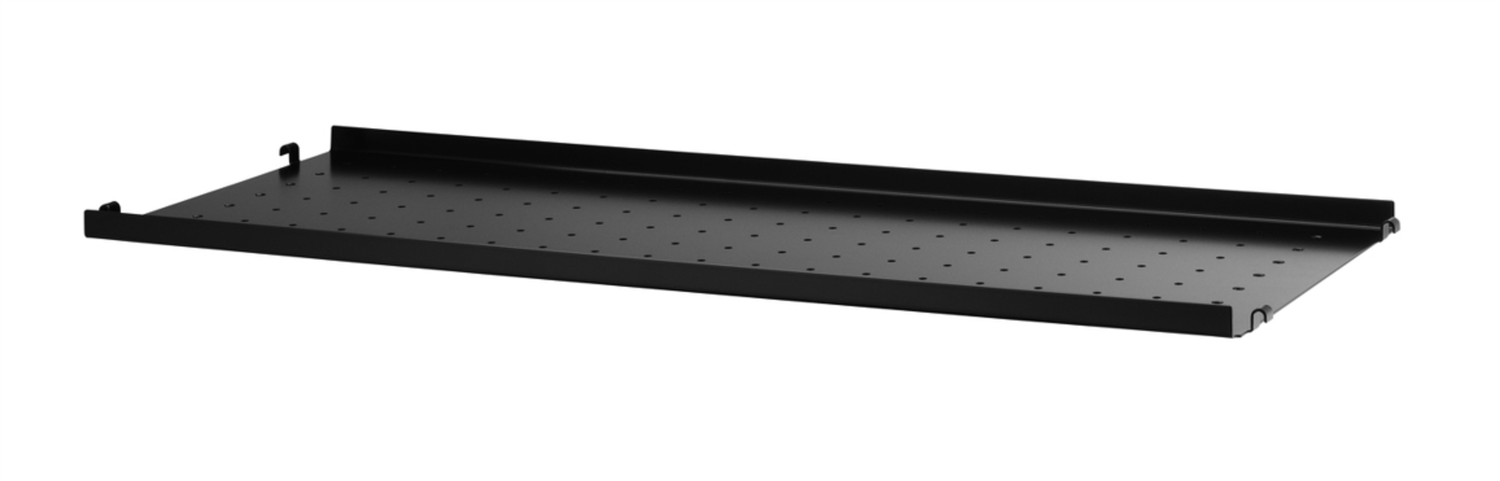 The metal shelves with low edge are available in two widths, 58 and 78 cm, along with two depths, 20 and 30 cm. The shelves are easy to move around and fit into wire and plex panels from String® System if the shelves and panels have the same depth. The 2 cm high edge makes the shelves blend right into a shelving combination with wooden shelves. The perforated shelves are the optimal base to be creative with our accessories. Add hooks, rods, or hanger racks to design your own unique shelf. Each packaging contains one metal shelf.