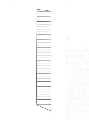 The floor panels are available in three heights, 85 cm, 115 cm, 200 cm along with one depth, 30 cm. The panels are the base when building your string shelf. When the panels are decided you can start adding products with 30 cm depth from String® System. Choose among shelves, cabinets, drawers, magazine shelves and more. The foot of the floor panel rests against the floor which makes the shelf stable while appearing light and airy. Make your shelf even more functional and unique by adding organizers, knife holder or a magazine holder, which all are placed on the panel’s threads. The panels come in two different packaging’s, either with one floor panel or two floor panels.