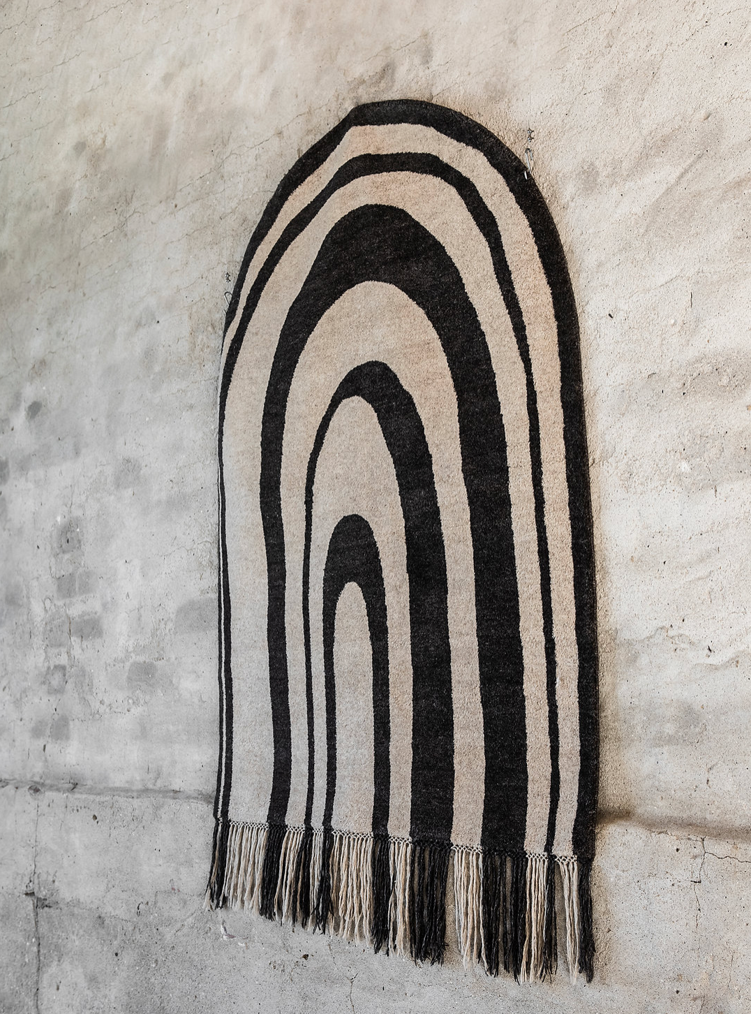 no.06 is a continuation of the iconic no.01 in a limited and luxe edition. The soft low pile has been hand knotted by the craftsmen with approximately 90 knots per inch which creates this true piece art. The curved triumph shape and the soft contrast between the dark grey and sandy beige creates an eclectic and bold signature piece. A long fringe edge elevates the end line and adds an arty detail.