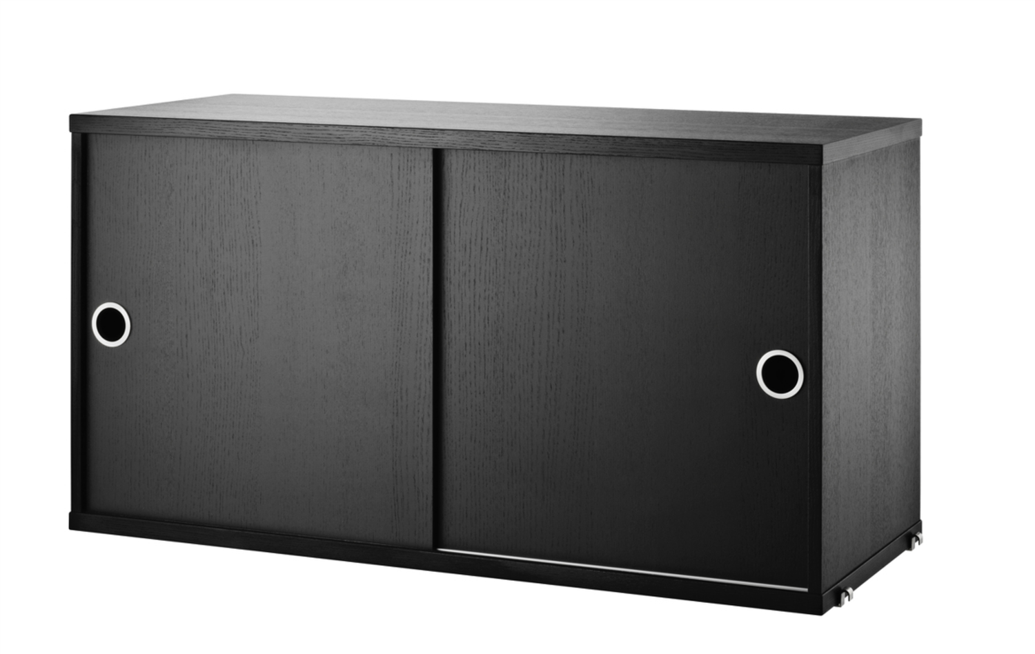 The cabinets with sliding doors are available in one width, 78 cm, along with two depths, 20 and 30 cm. The cabinets fit into all wire and plex panels from String® System. It is visually pleasing to add a bolder element to your shelf, like a cabinet, which also give you a lot of extra storage. The cabinet consists of one divider placed in the middle along with two adjustable inner shelves. The cabinet’s inner dimensions are 4 cm less than the outer dimensions. The cabinets are delivered unassembled.