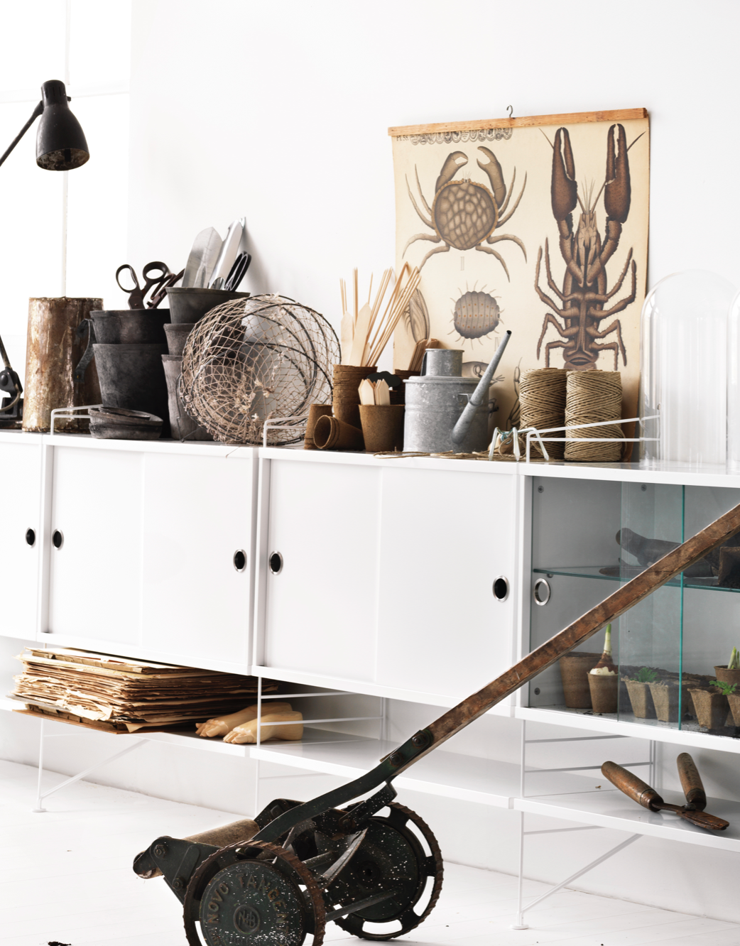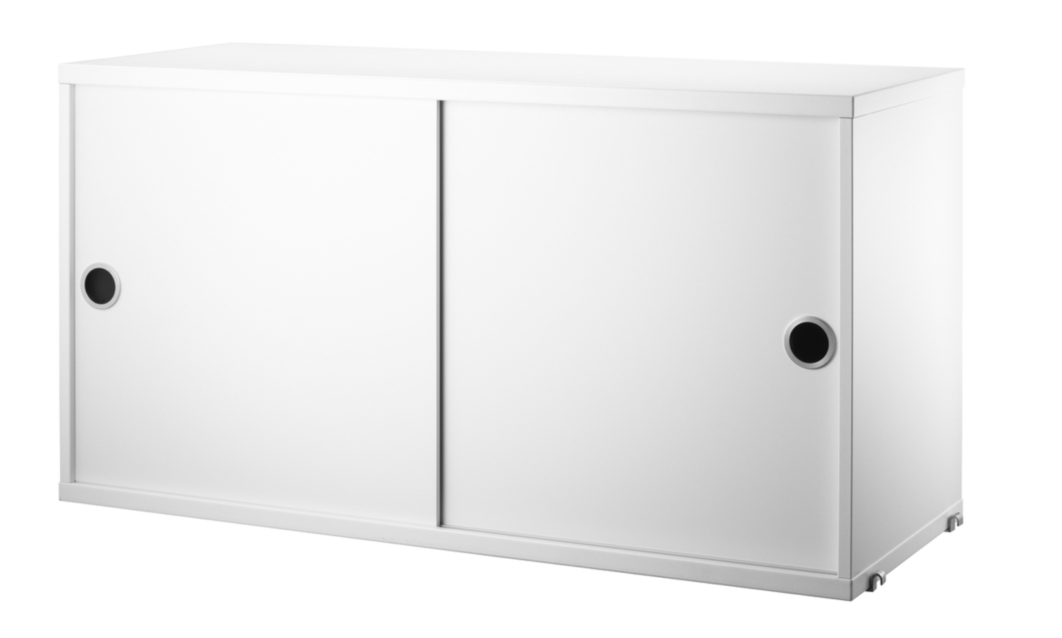 The cabinets with sliding doors are available in one width, 78 cm, along with two depths, 20 and 30 cm. The cabinets fit into all wire and plex panels from String® System. It is visually pleasing to add a bolder element to your shelf, like a cabinet, which also give you a lot of extra storage. The cabinet consists of one divider placed in the middle along with two adjustable inner shelves. The cabinet’s inner dimensions are 4 cm less than the outer dimensions. The cabinets are delivered unassembled.