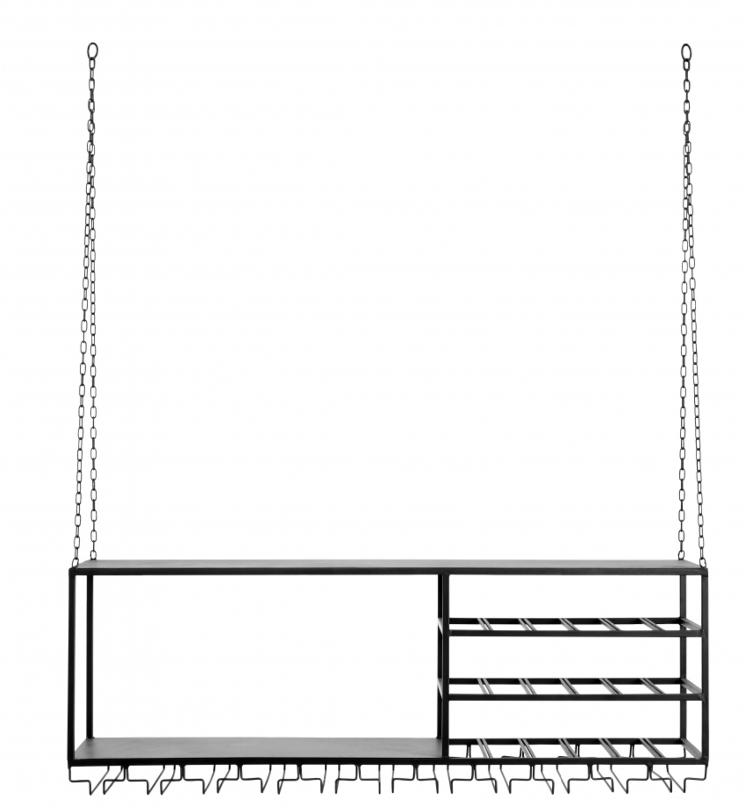 A practical iron rack for ceiling mounting. For wine glasses, wine bottles etc. in the kitchen.
