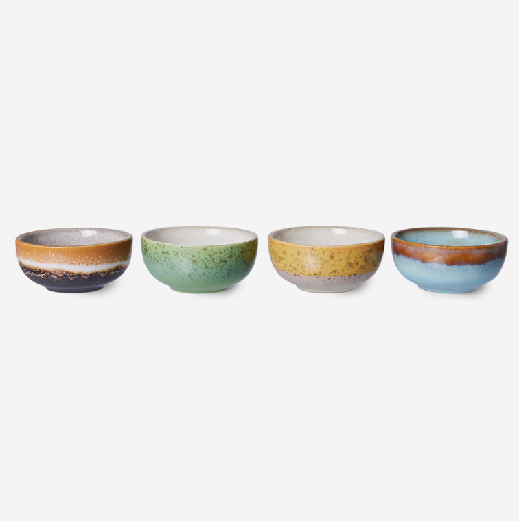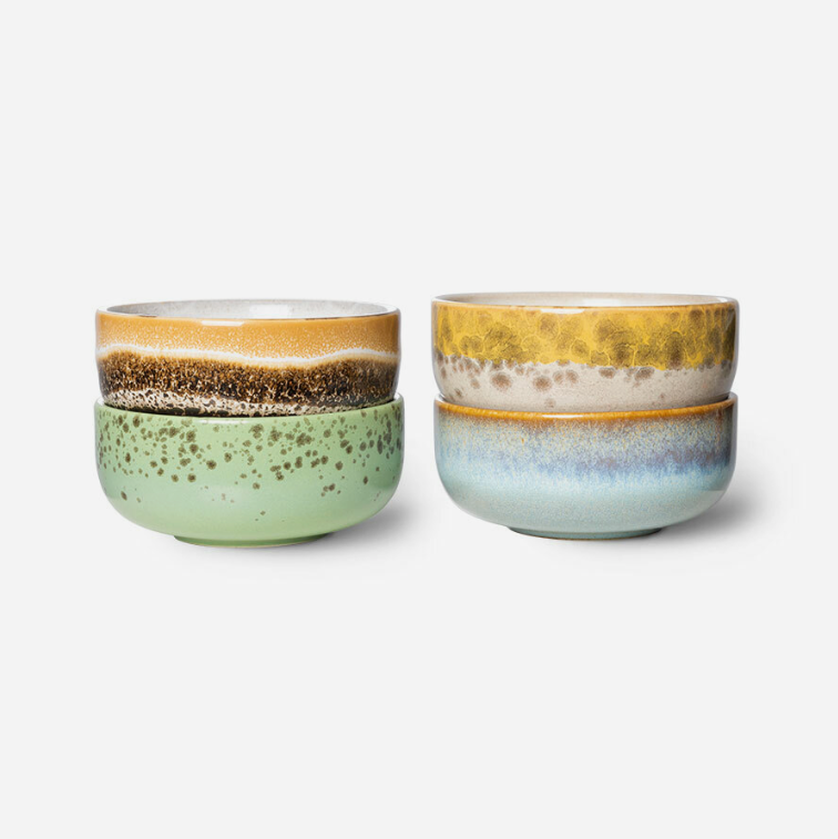 Keramikk skåler inspirert av 70 tallet. Settet består av fire unike skåler med forskjellige finisher.